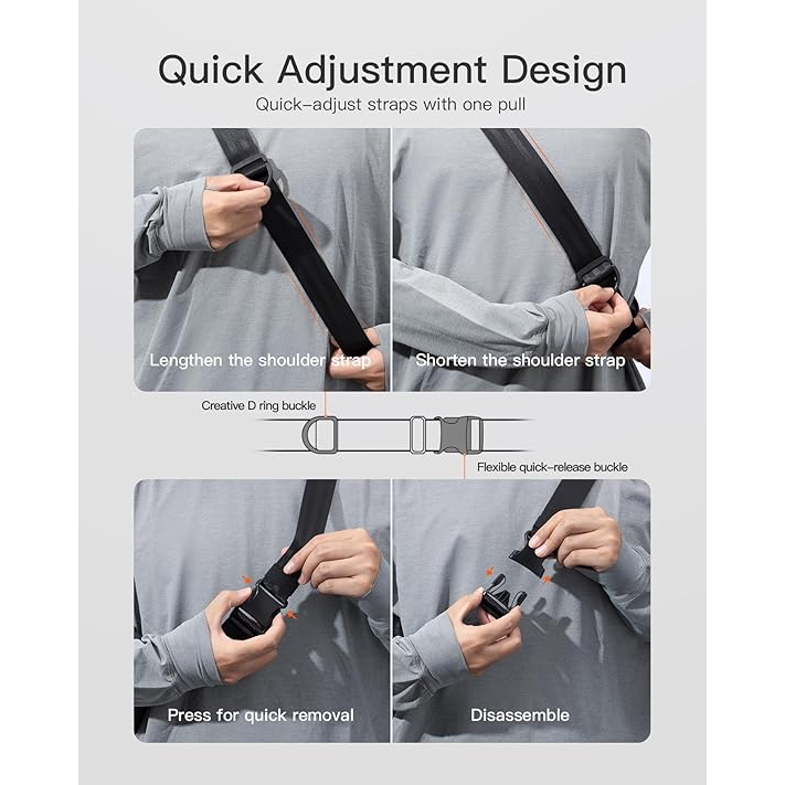 Bu çapraz askılı çantanın omuz askısı, çeşitli taşıma ihtiyaçlarını karşılamak için kayış uzunluğunun (29–48 inç) düzgün bir şekilde ayarlanmasını sağlayan kare ve D halkalı tokaların bir kombinasyonunu benimser.