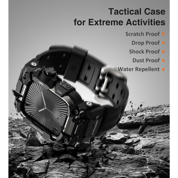 Ultimal Rugged Apple watch kayışı, güçlendirilmiş TPU ve metalden üretilmiştir, saati düşmeye karşı korumak için askeri düzeyde sağlamlığa sahip Rugged Kılıf, çizilmeyi ve kazadan kaynaklanan darbeyi önlemek için 3D yükseltilmiş çerçeve.