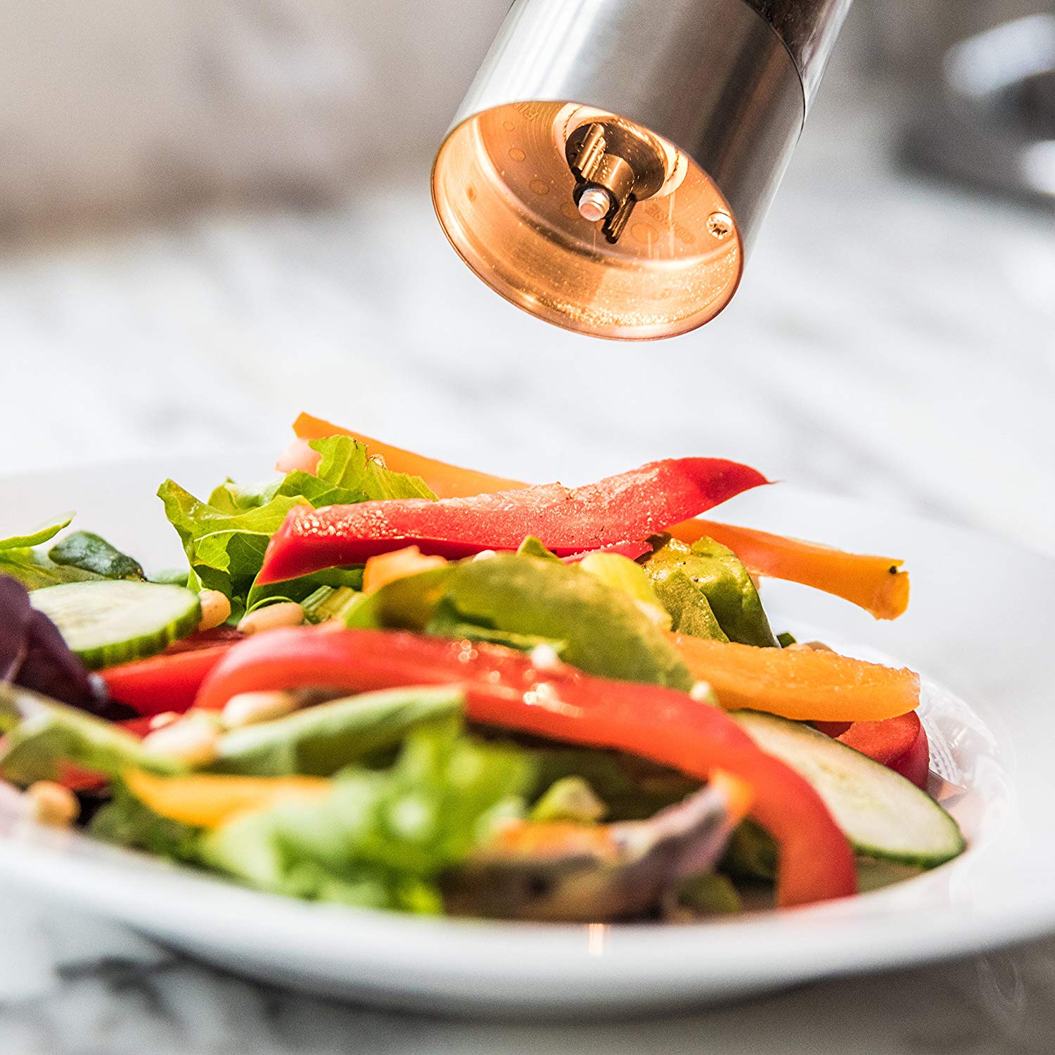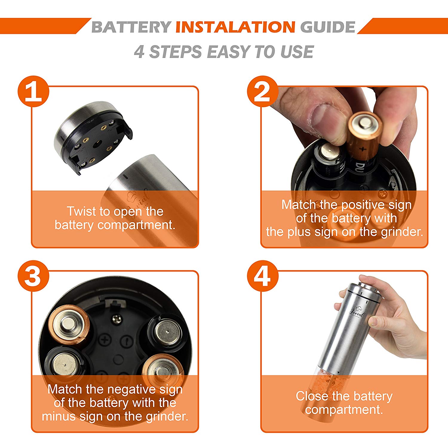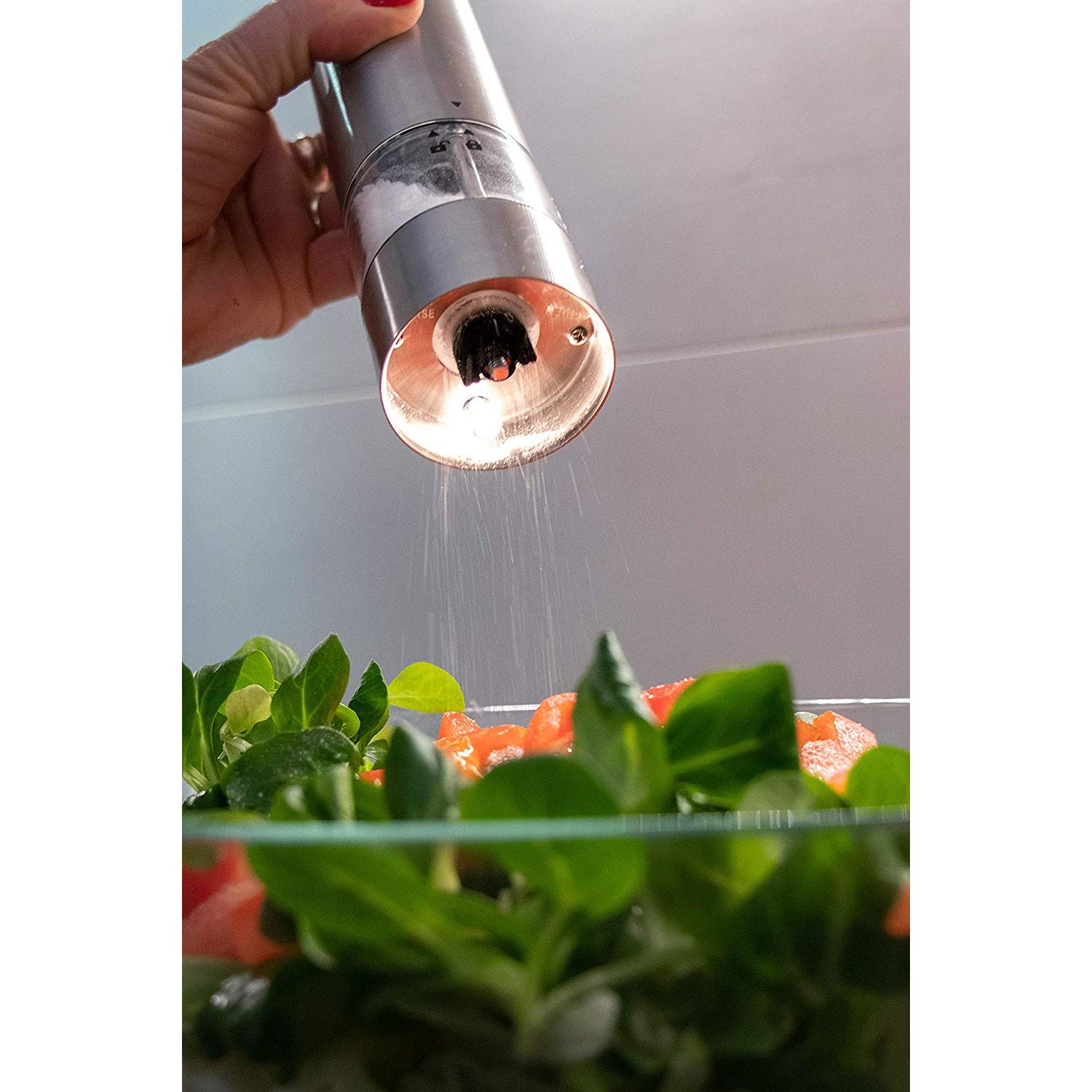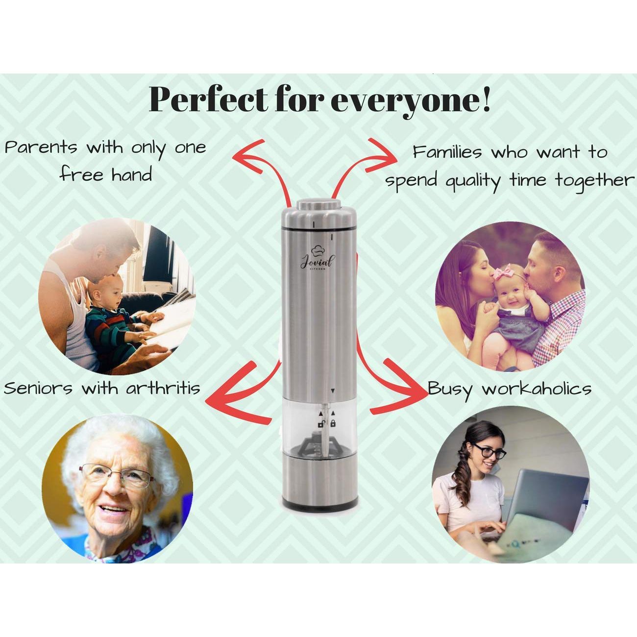 KALİTE: Elektrikli Tuz veya Karabiber Değirmeni İçin Flafster Kitchen (eski Jovial Kitchen), en yüksek kalite standartlarını karşılamak ve mutfağınızın şık ve şık görünmesini sağlamak ve birinci sınıf ve eşsiz bir deneyim sağlamak için en yüksek kalitede paslanmaz çelik kullanmıştır. Zarif tasarımı ve hediye kutusu, bu elektrikli öğütücüyü İşçi Bayramı ve diğer durumlar için mükemmel bir hediye haline getirir - HER DETAYI DİKKAT: Ailemiz kişisel olarak hem elektrikli biber öğütücüsünün hem de kutunun tasarım sürecinde yer aldı, çünkü en iyisini teklif et. Bu elektrikli tuz veya karabiber değirmeni normal tuz ve biber çalkalayıcılar için mükemmel bir alternatiftir! Birçok müşteri, pille çalışan tuz veya karabiber değirmeninin sadece modern genç erkekler için değil, artritli yaşlılar için de mükemmel bir seçim olduğunu onayladı - AYARLANABİLİR KABAK: Seramik öğütücü, tüm ihtiyaçların sağlandığından emin olmak için farklı işlem seviyelerine sahiptir. Ek olarak, yerleşik ışık, tüm öğünlerinizin mükemmellik için baharatlandırılmasını sağlar; Elektrikli taşlama makinesi yalnızca Himalaya Tuzu ve Karabiber Karabiber ile değil, diğer baharatlarla da kullanılabilir; Bonus ipucu: baharatları öğütmeden önce kızartırsanız, aromayı ve daha karmaşık bir aromayı daha da alırsınız - KULLANIMI KOLAY: Lastik kapağı masanıza takmak ve temiz tutmak kolaydır; yenilikçi tasarım başlığı yerinde tutar ve düşmesini önler; tek elle kolay işlem, pille çalışan tuz öğütücünün optimum performansına katkıda bulunur; otomatik karabiber değirmeni 4AA şarj edilemeyen bataryalara ihtiyaç duyar, paslanmaz çelik tuz / karabiber öğütücüsünün modern tasarımı bataryaların kolayca açılmasını ve çeşnilerin tekrar doldurulmasını sağlar.