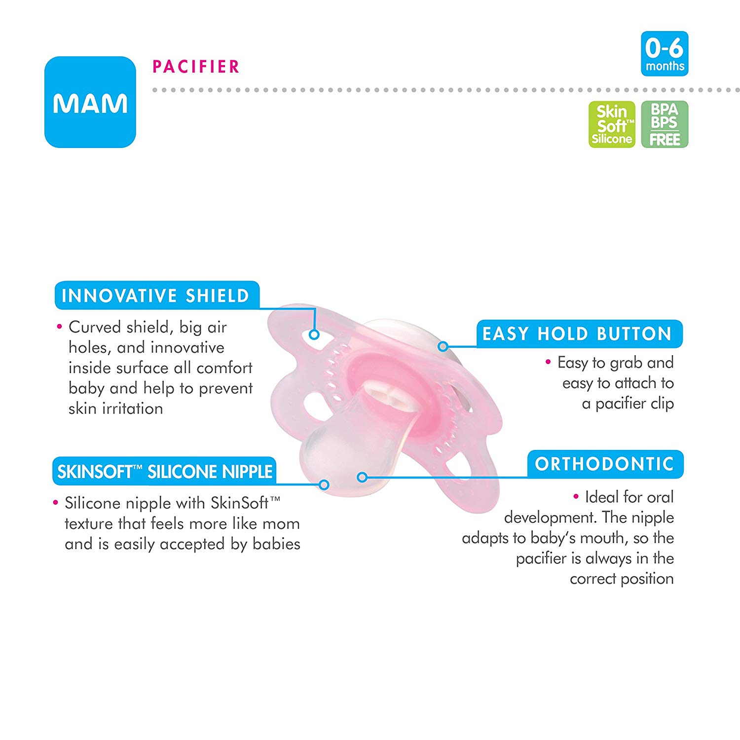 CALMS & SOOTHES BEBEKLER 0-6 AYLAR: MAM emzirme nipeli, ebeveynler ve tıbbi uzmanlar tarafından annelerin göğsünü 0-6 aylık bebekler gevşetmek için hissetmek üzere tasarlanmıştır. - KOLAY TEMİZLEME: MAM emzikler, 3 dakika içinde gelmeleri durumunda mikrodalga fırında sterilize olur, seyahat ve seyahat için mükemmeldir. - TAŞIMA DURUMU: MAM emzikler, MAM emziklerinizi hareket halindeyken temiz tutmak için mükemmel olan yeniden kullanılabilir emzik taşıma çantasına sahiptir. - HER ZAMAN DOĞRU YAN YUKARI: Simetrik nipel, böylece emzik asla yanlış şekilde yerleştirilemez. Asimetrik meme uçlarına sahip diğer emziklerin (NUK emzik, Dr Browns emzik, Playtex emzik), ebeveynlerin bebeği yatıştırmak için elle ayarlanması gerekir ve yanlış yerleştirildiğinde oral gelişimi olumsuz yönde etkileyebilir. - CİLT TAHRİŞİ ÖNLEME İÇİN TASARLANMIŞTIR: MAM Emzikler, havanın bebeğin cildine tahrişi azaltmak için ulaşmasını sağlamak için geniş hava delikleri içerir. Kavisli siperi ve iç siper yüzeyindeki yenilikçi tümsekler, emziklerin bebeğe tamamen aynı hizada yayılmasını önler