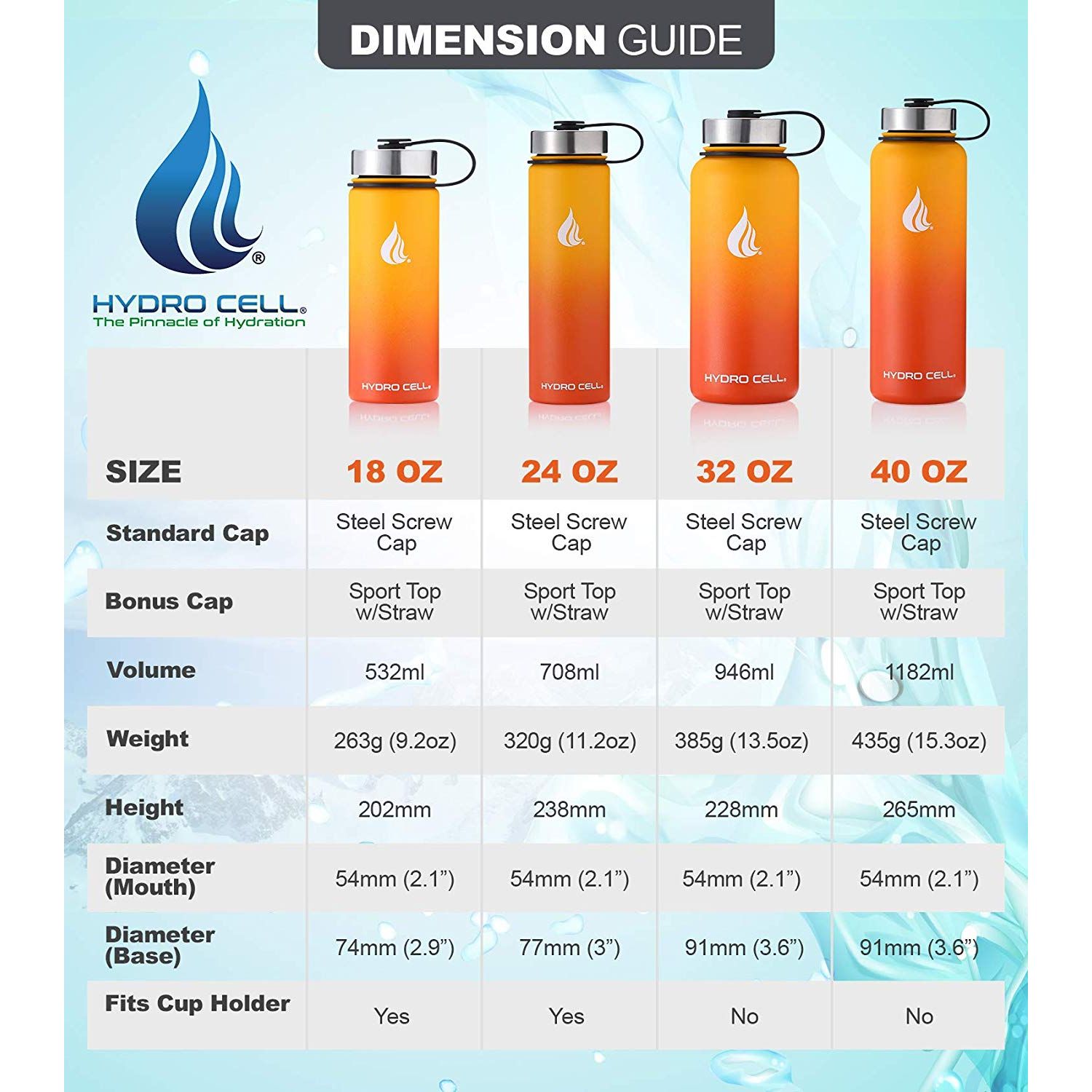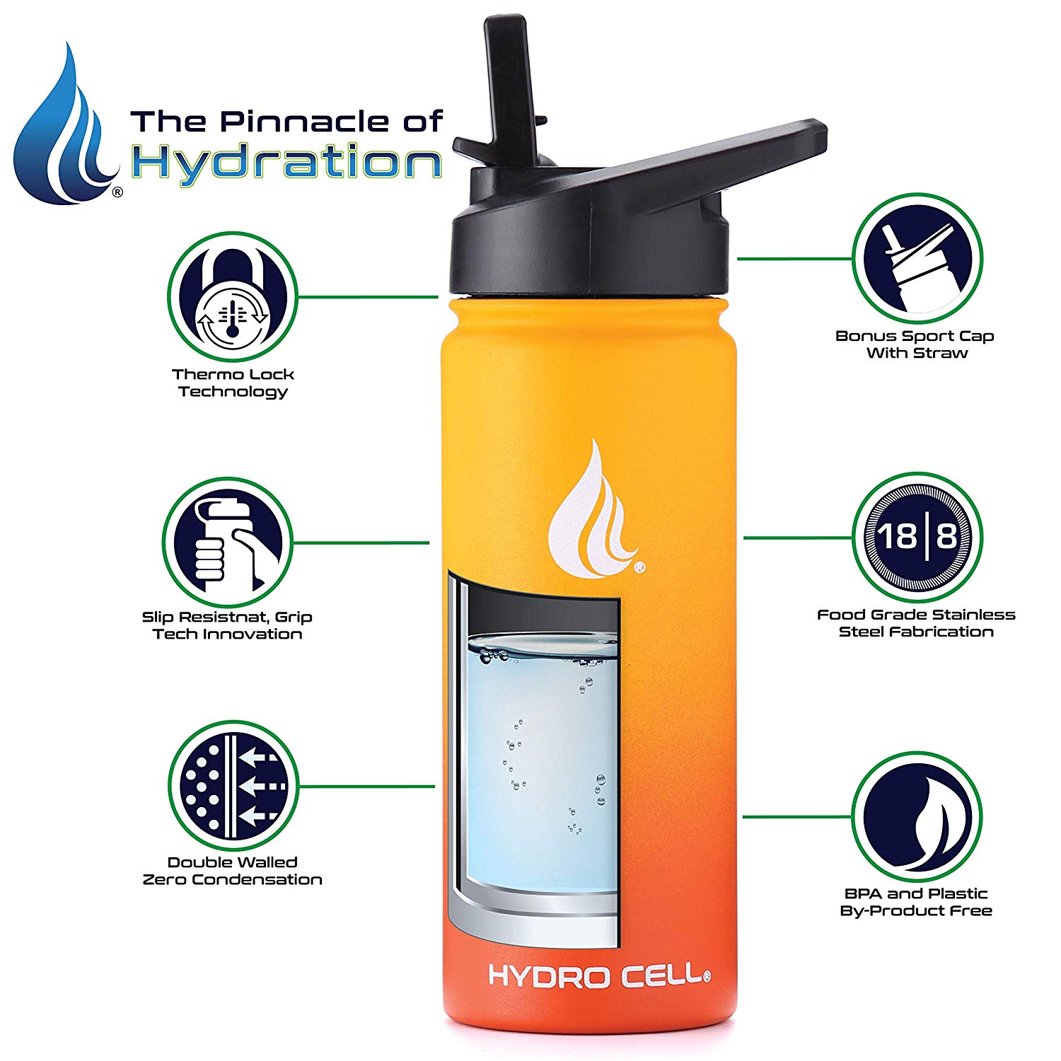 Her şişe iki kapaklı olarak gelir. Hydro Cell Su Şişesi, hava sızdırmaz bir vakum contası oluşturan ve seyahat ve dış mekan maceraları için mükemmel olan, ekli paslanmaz çelik vidalı kapakla standart olarak gelir. Hydro Cell ayrıca Straw'lu bir Bonus Sport Cap ile birlikte gelir, bu kapak hareketli parçalar nedeniyle% 100 hava geçirmez değildir ve atletizm ve kente özgü aktivite için mükemmeldir. - SWEAT YOK, PROBLEM YOK Bu su şişesi, oksidasyon ve korozyona karşı tamamen dayanıklı olan en yüksek kalite 18/8 Paslanmaz Çelik ile birlikte gelir. Kaymaz Toz Boya tabakası, bir egzersiz, yürüyüş veya yoga sırasında şişenize takılmasını sağlar. Hydro Cell, tüm faaliyetler için mükemmel bir arkadaştır. - MÜKEMMEL SOĞUK VEYA SICAKLI SIVI TUTMAK İÇİN MÜHENDİSLER Sıfır yoğuşma ve içeceğinizin ısılı bir odada en fazla ısınmasını sağlamak için su şişesi çift cidarlı ve vakumlu olarak kapatılmıştır. Soğuk sıvılar 24 saat soğuk kalır ve sıcak sıvılar