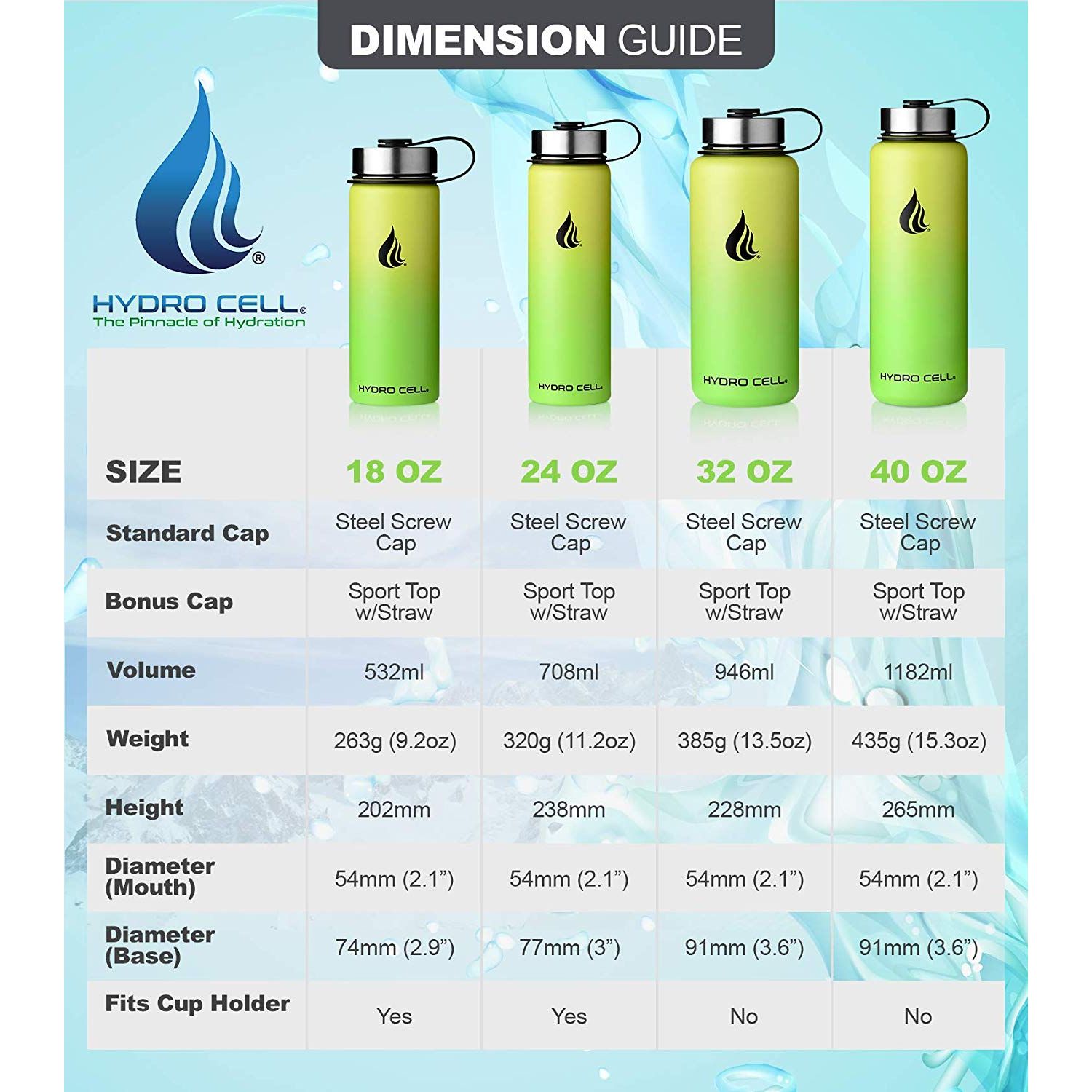 Her şişe iki kapaklı olarak gelir. Hydro Cell Su Şişesi, hava sızdırmaz bir vakum contası oluşturan ve seyahat ve dış mekan maceraları için mükemmel olan, ekli paslanmaz çelik vidalı kapakla standart olarak gelir. Hydro Cell ayrıca Straw'lu bir Bonus Sport Cap ile birlikte gelir, bu kapak hareketli parçalar nedeniyle% 100 hava geçirmez değildir ve atletizm ve kente özgü aktivite için mükemmeldir. - SWEAT YOK, PROBLEM YOK Bu su şişesi, oksidasyon ve korozyona karşı tamamen dayanıklı olan en yüksek kalite 18/8 Paslanmaz Çelik ile birlikte gelir. Kaymaz Toz Boya tabakası, bir egzersiz, yürüyüş veya yoga sırasında şişenize takılmasını sağlar. Hydro Cell, tüm faaliyetler için mükemmel bir arkadaştır. - MÜKEMMEL SOĞUK VEYA SICAKLI SIVI TUTMAK İÇİN MÜHENDİSLER Sıfır yoğuşma ve içeceğinizin ısılı bir odada en fazla ısınmasını sağlamak için su şişesi çift cidarlı ve vakumlu olarak kapatılmıştır. Soğuk sıvılar 24 saat soğuk kalır ve sıcak sıvılar