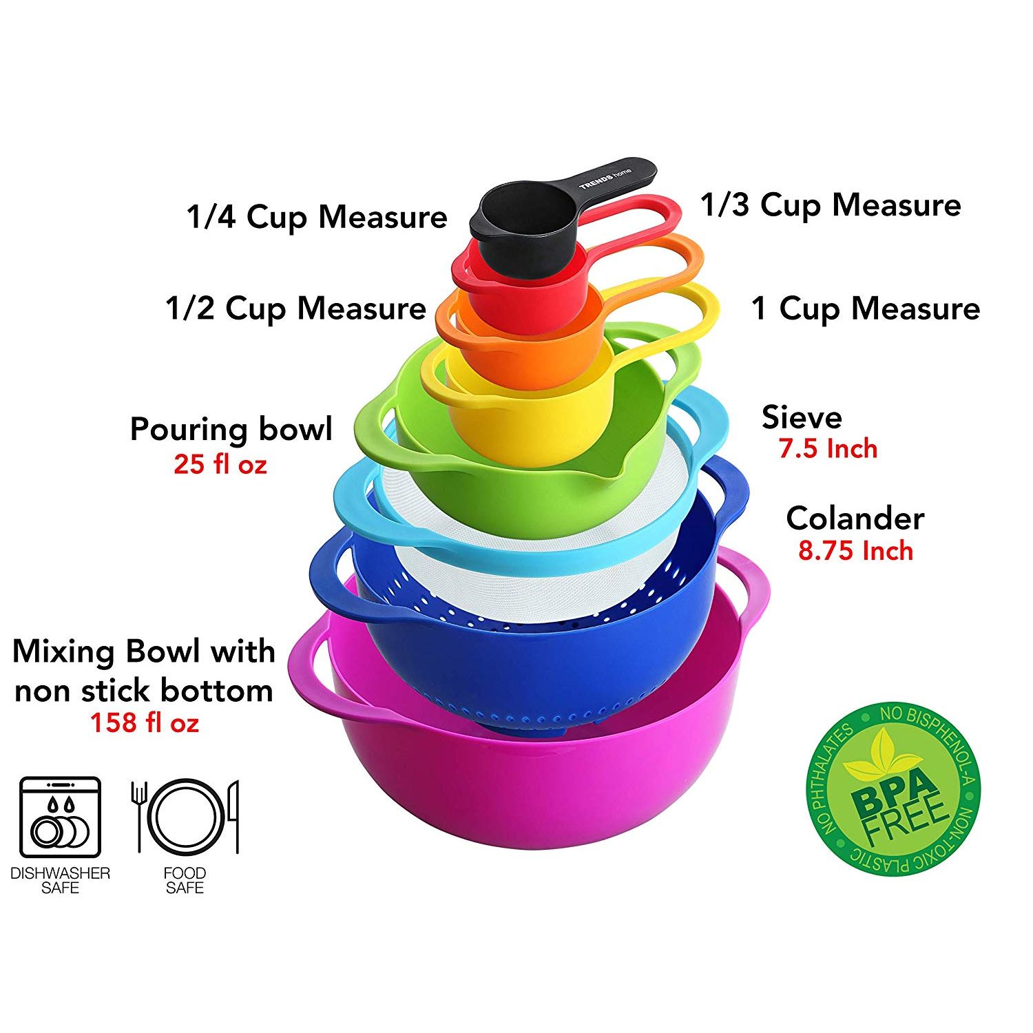 DAYANIKLI: Nestling Bowl seti, uzun süreli dayanıklılık için garantili temel, pratik bir mutfak setidir. Çok az yer kaplar ve fırıncılar için esastır. Her ev ve mutfak için idealdir. Bu kaliteli 8 parçalı karıştırma kabı seti, Toksik Olmayan ve Antibakteriyel plastik karıştırma kabı seti, mikrodalgaya karşı güvenli ve bulaşık makinesinde yıkanabilir. - 8 BİR BOYUTTA BEDENLER: Renkli mutfak karıştırma kabı seti, ölçü kabı ve kaşık seti şunları içerir: Ölçüm kabı: 1 / 4cup (60ml), 1 / 3cup (85ml), 1 / 2cup (125ml), 1cup (250ml) Kaseler: 25 fl oz (700ml) ve 158 fl oz (4.5L) Elek: 58 fl oz (1.65L), 7 inç (19cm) Kevgir: 105 fl oz (3L), 8 inç (22cm). Her ürünün taşımayı ve tutmayı basitleştiren kullanımı kolay tutacakları vardır. Bu karışım kaselerindeki her şey BPA içermez, gıda güvenli, Toksik Olmayan ve Antibakteriyel Plastikten yapılır. - KALİTE: Bu Karıştırma kaseleri, karıştırma faaliyetleri sırasında hareketi önleyen kaymaz bir tabana sahiptir. Kevgir pr pr stabilitesini sağlamak ayak