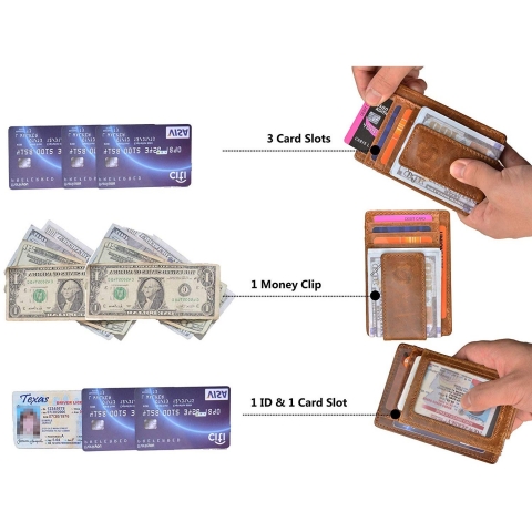 Malzeme: Kalifiye hat kaplamalı, aşınmaya dayanıklı ve uzun ömürlü yüksek kaliteli orijinal Crazy Horse deri. - Boyut: 10 * 6.5 * 0.5cm, ultra ince tasarım ve taşıması kolay. - Yapım: 6 kart yuvası, yan tarafta 1 cep ve 1 güçlü manyetik para klipsi. - Güçlü Manyetizma ve RFID Engelleme: Bol miktarda para ve fatura tutabilir; Hayati bilgilerinizi Güvenli tutar. Electronic Pick cebe karşı güvende ve korunun.