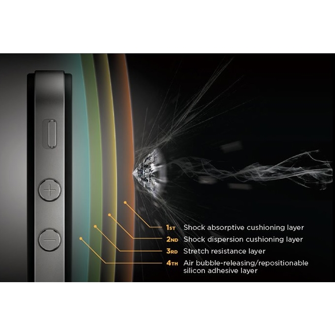 BUFF ekran koruyucu film dört katmandan oluşur ve her bir katmanın farklı işlevi vardır. Öncelikle, darbe emici ve dağıtıcı katman ile dış darbelere karşı çift koruma sağlar. Bu ilk katman darbelerin büyük bir kısmını absorbe ederek yok eder. Daha sonra bu katmandan geçen darbeler, darbe dağıtıcı katman tarafından dağıtılır.