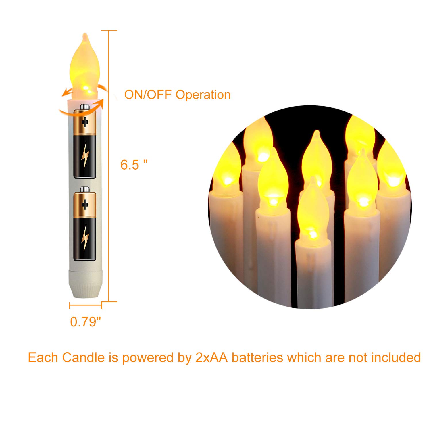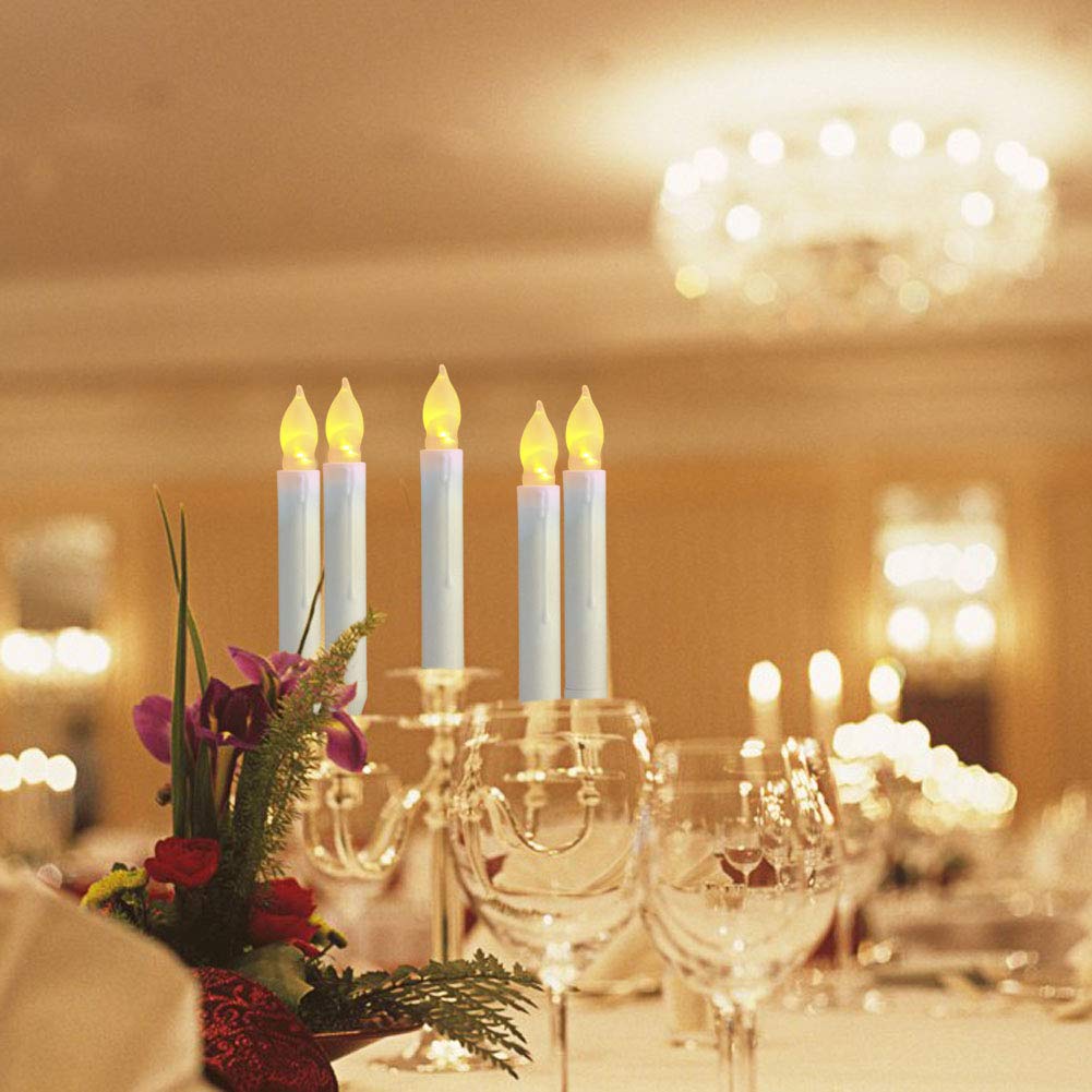 RELAXING IŞIK VE YARATICI HEDİYELER - Gerçekçi sıcak sarı alev yumuşak ve yumuşak bir şekilde titrer, çok parlak değil, çok koyu değil, Gerçek bir mum mumu gibi. Geleneksel mumların dumanı olmadan ev dekorasyonunuza, festival kutlamanıza ve kilise hizmetinize mükemmel bir katkı. Ayrıca ailenize ve arkadaşlarınıza YARATICI bir HEDİYE. Ayrıca, pille çalışan konik mumları çeşitli konik mum çubuklarına koyabilir veya doğrudan masaya ruh ışıkları olarak yerleştirebilirsiniz. - YÜKSEK KALİTE VE ÖZELLİKLER - Ev tipi konik LED mumlar yüksek kaliteli Fildişi Plastikten üretilmiştir, yavaşça yanıp sönüyor, güzel ve gerçekçi görünüyor. Çeşitli konik mumluklar ve avizeler için uygun olan mükemmel boyut 0.79 "D x 6.5" H. Geleneksel konik muma mükemmel bir alternatif. - GELENEKSEL MUMLARA ALTERNATİF - Geliştirilmiş pil konik şamdanlarımız, ışığı kontrol etmek için üst kısmı vidalayarak / sökerek açıp kapatacak şekilde tasarlanmıştır. Şimdi onların kötü iletişim kurma sorunları hakkında endişelenmenize gerek yok