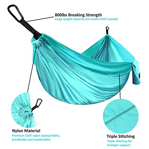 EKSTRA BÜYÜK BOY - 500 lbs'ye kadar rahatça destek: Bu çift kamp hamak 2 kişiye uyar, arkadaşınızla birlikte ya da sevdiklerinizle birlikte uzanabilirsiniz ve hala bolca yeriniz olacak. Yeni 210T naylon paraşüt kumaşı nedeniyle, bu çift kamp hamak 500 lbs'ye kadar rahatlatıcı destek sağlar. Lüks boyutlu, 125,4 x 79 inç (10,4 ft x 6,58 ft) ölçülerinde XL - SÜPER GÜÇLÜ - Benzersiz kayış tasarımı 1000 lbs kırılma gücüne sahiptir! Çoğu rakip hamakta iki kat daha güçlü. Premium 210T naylon kumaştan yapılmış kamp hamak malzemesi - ULTRALIGHT & COMPACT - Çuval, kamp hamakının içine kolayca dikilir, böylece asla kaybetmezsiniz. HIZLI VE KOLAY KURULUM - Birlikte verilen torbadan saniyeler içinde açılır. İki ağır hizmet tipi karabina ve iki ağaç askısı içerir. PAKET - Çift kamp jambonu içerir