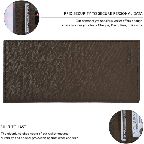Materyal: Çek karnesi tutucumuz yumuşak ve uzun ömürlü% 100 hakiki deriden yapılmıştır. Daha iyi dayanıklılık için aşınmaya ve yıpranmaya karşı hassas bir şekilde dikilmiştir. - Yapı: Deri çek defteri kapağı 6,75 x 3,5 inç boyutlarındadır. Çek defterinizi veya nakit paranızı saklamak için 1 not bölmesi, 1 kimlik bölmesi, 1 çek defteri tutucusu, ücretsiz bir ayırıcı ve kredi kartı veya kartvizitleri saklamak için 5 kart yuvası vardır. - Güvenlik ve Güvenlik: Çek defteri kapaklarımız, değerli kişisel bilgilerinizi korumak için gelişmiş RFID engelleme teknolojisi ile donatılmıştır. Hırsızlar kişisel verileri çalmaktan korunur ve böylece çek defteri kapağı için yüksek düzeyde güvenlik sağlanır. - Tasarım: Erkekler ve kadınlar için çek defteri kapağı küçük, hafif
