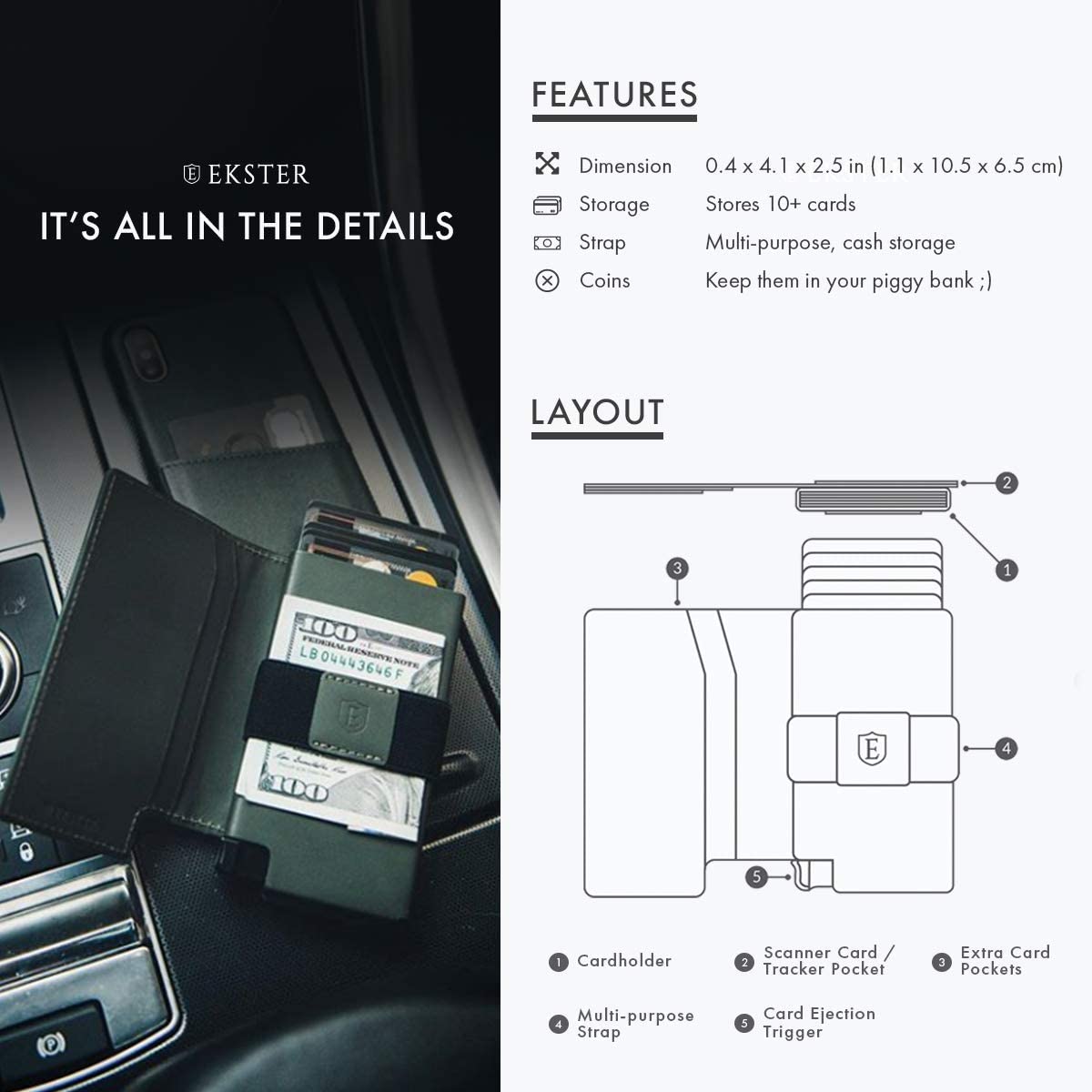 KOLAY ERİŞİM Tek bir tıklama ile anında kart erişimi. Toplamda 10+ kart saklar; yerleşik alüminyum kart sahibi, kabartmalı kart sayısına bağlı olarak 4-6 saklar ve cep askısı 4 ek kart + nakit tutar. - PREMIUM MALZEMELER Birinci sınıf birinci sınıf deriden el yapımı, altın dereceli LWG sertifikalı protokoller altında tabaklanmış ve uzay grisi anodize edilmiş 6063 T5 Alüminyum. - RFID KORUMASI Entegre RFID engelleme teknolojisi, kartlarınızı deniz süpürücülerinden koruyarak sizi artan elektronik yankesicilik riskine karşı korur.