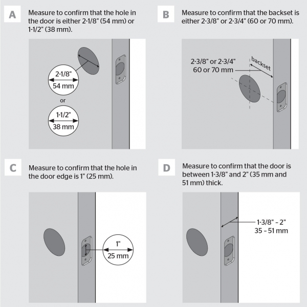 Kapının deliğinin 2-1 / 8 "veya 1-1 / 2" olduğuna emin olun. Arka setin 2-3 / 8 "veya 2-3 / 4" olduğuna emin olun. Kapı kenarındaki deliğin 1 " olduğuna emin olun. Lütfen ürün resimlerine eklenen boyutlandırma özellikleri tablosuna bakın.