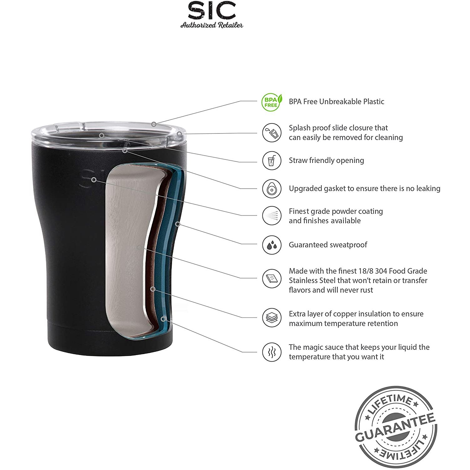 ŞARAP VE KOKTEYLLER İÇİN MÜKEMMEL Şarabınızı mükemmel sıcaklıkta tutun, sıcaklığın korunması konusunda ciddiydik. Kırmızı şaraplar en iyi 55-65 derece arasında servis edilirken, beyaz şaraplar en iyi 49-55 derece arasında servis edilir. Artı: sulandırılmış kokteyllere veda edin! - KAHVE İÇİN MÜKEMMEL Bazıları kahvenin sıcak olmasını tercih ederken, diğerleri buzlu kahveyi tercih eder. Vakum yalıtımımız, kahvenizi tam olarak doğru sıcaklıkta tutacaktır. - TERE DAYANIKLI, TEMİZ BİR İÇME DENEYİMİNİN KEYFİNİ ÇIKARIN Üç katmanlı yalıtım teknolojimiz, terletmeyen bir içme deneyimini garanti eder. Sehpanızda bardak altlığı ve ter halkası yok! SIC bardaklar, özellikle çeşitli renk ve dokular arasından seçim yapabileceğiniz yelpazemizle kaliteli hediyeler de yapar.
