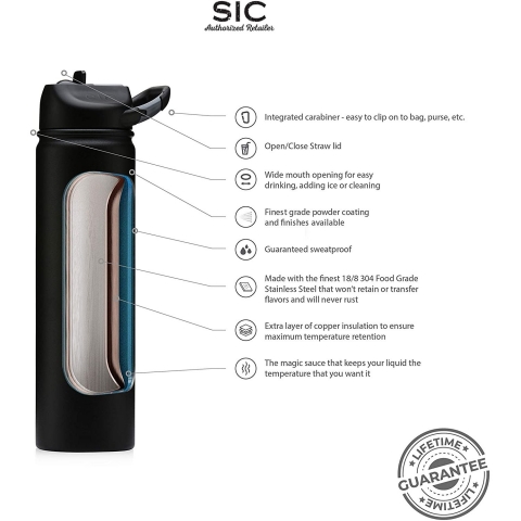 CİDDİ BUZ SOĞUK (VEYA SICAK)! Üç katmanlı vakum yalıtımımızla en sevdiğiniz içecek tüm gün boyunca mükemmel sıcaklıkta kalacaktır. Sıcaklığın korunması konusunda ciddiydik. Nerede olursan ol seni yanındayız. - BARDAK TUTUCUNUZA UYGUN  SIC şişeyi çoğu bardak tutucusuna uyacak ve bir şişe şarabın tamamını alacak kadar büyük olacak şekilde tasarladık. İşlevsel, eğlenceli ve SIC! - KARABİNER İLE FONKSİYONEL YENİ KAPAK SIC termos standart olarak kesintisiz, entegre bir karabina kapağı ile birlikte gelir. Artık SIC şişenizi zahmetsizce sırt çantanıza veya çantanıza takabilirsiniz.