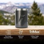 TRIMAX ÜÇLÜ YALITIMLI KAHVE VE İÇECEK MUG: TRANSIT, ergonomik saplı ve kayan su sıçramayan kapaklı üçlü yalıtımlı kahve bardağımızdır. Kahve kupamız en sevdiğiniz içecekleri 40 saat soğuk, 4 saat sıcak tutar. Kamp ateşi yalıtımlı kahve kupamız, iç ve dış paslanmaz çelik tabakası, vakum merkezi, bakır iç, kaymaz silikon taban ve pürüzsüz içme kenarı içerir. - SICAK EL SOĞUK İÇECEK (VEYA SICAK!): Bu dayanıklı TRANSIT kahve bardağı, vakum yalıtımlı paslanmaz çelikten yapılmıştır ve sıcak kahveden soğuk kokteyle kadar her türlü sıcak veya soğuk içecek için idealdir. Erkekler ve kadınlar için siyah seyahat bardağımız da geri dönüştürülebilir malzemeden yapılmıştır, BPA içermez ve ftalat veya astar içermez.