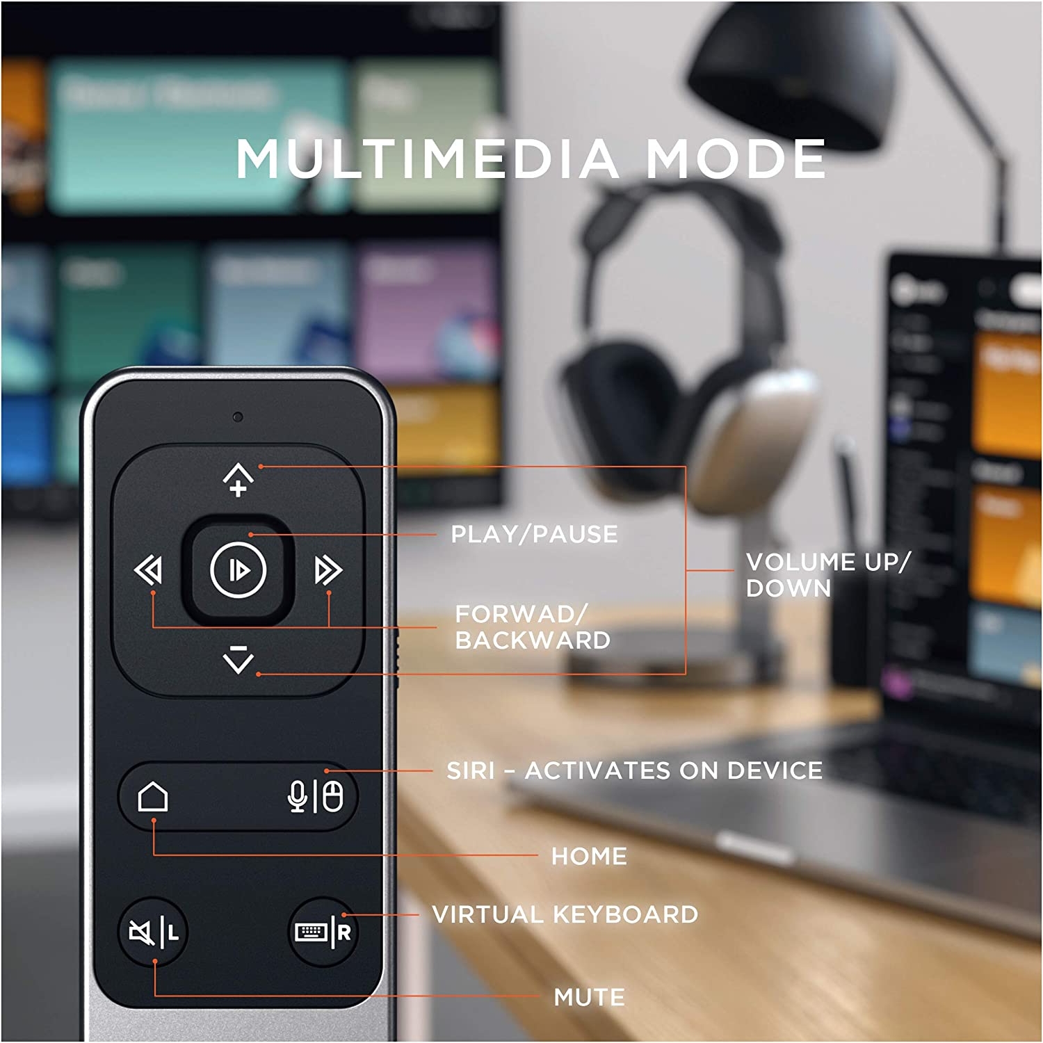 Müziği, videoları ve daha fazlasını kontrol etmek için R2 uzaktan kumandanın Multimedya modunu (M) kullanın, ses seviyesini ayarlama, ileri / geri gitme, oynatma / duraklatma, ev / Siri, sessize alma ve sanal klavyeyi etkinleştirme dahil.