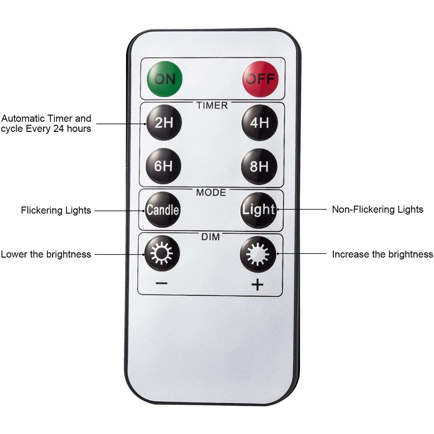 İnanılmaz derecede gerçekçi dans eden alev LED Mum, alev simülasyon teknolojisi, mumların çok inandırıcı bir şekilde sallanmasını ve titremesini sağlar. Işık, çocuklar ve evcil hayvanlar, gerçek ateş içermeyen LED mumlar, yangınla ilgili kazalar hakkında bir daha asla endişelenme. - Tek bir uzaktan kumanda ile tüm mumlarımızı kontrol edebilirsiniz. - 10 tuşlu uzaktan zamanlayıcı, zamanlayıcı ayarlandıktan sonra, mum her gün aynı saatte yanar ve 2 saat / 4 saat / 6 saat / 8 saat açık kalır.