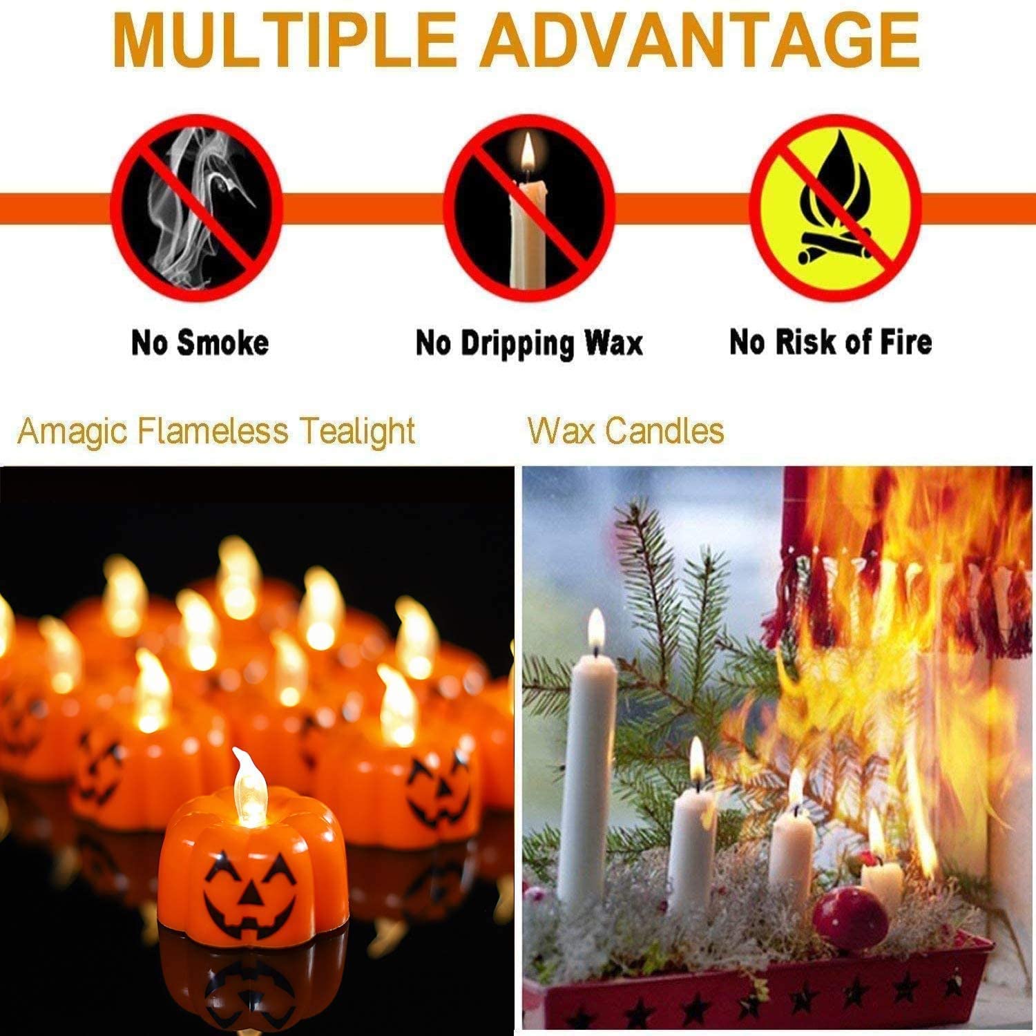 Gerçekçi Kabak Yüzü Tealight Mumları: Sevimli mini siyah gülen yüz, sizin ve çocuklarınızın cadılar bayramınızı süslemesi için uygundur.Bazı Cadılar Bayramı desenleri çizin veya ışıkları DIY el işi yapın.Çocuğunuzun kovasına Jack o'Lantern masasına koyun veya yanınıza asın pencere ağacı sundurma Güzel yapay kabaklar yaratıcı bir hediye olacak - Alevsiz Mum Kolay ve Güvenli Kullanım: CR2032 pillerle çalışan bu LED ampul balkabağı şeklindeki çay fenerleri (dahil) Yangın için endişelenmeyin çok güvenli.