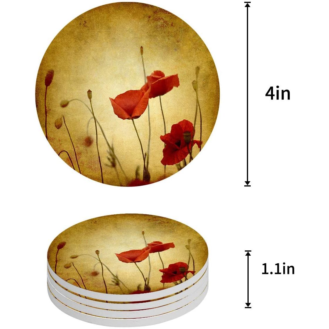 Leotear 4 Adet Seramik Bardak Altlığı (Kırmızı Çiçek)
