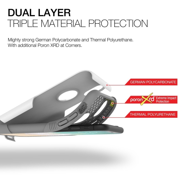 Çift katmanlı üçlü malzeme korumasına sahiptir (polikarbonat, TPU, köşelerde Poron XRD'li).