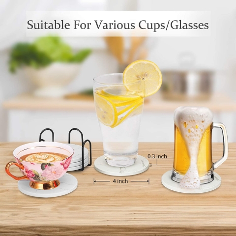 Emici İçecek Altlıkları: Mermer emici bardak altlıkları, suya izin veren ancak Asla solmayan Özel Sır ile nem emici seramik malzemeden yapılmıştır. Seramik su emilimi, geleneksel mermer, silikon ve deri bardak altlıklarından çok daha iyidir. İçecekler için seramik bardak altlıkları, dökülen kahve ve kola lekelerini 10-15 saniye içinde hızla emer.