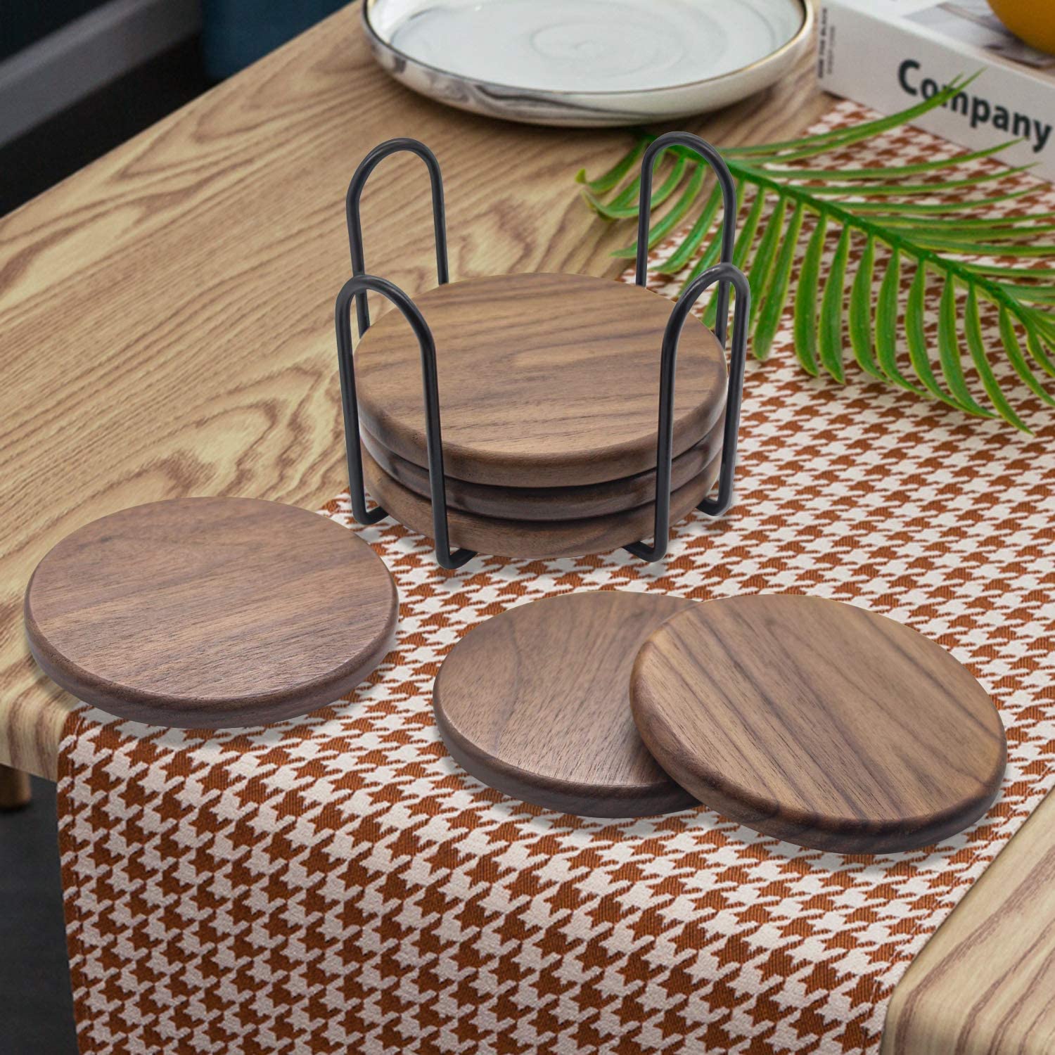 Masif ahşapDoğal ahşap dokulu, 4 inç yapışmaz bardaklar, masanızı kuru tutan ve mobilyalarınızı koruyan çatlamaz, dayanıklı ve uzun ömürlüdür, Günlük aile kullanımı için en iyi seçim. Masalarınızı ve diğer yüzeylerinizi çizmeyen, bardak altlıklarını saklamak ve yerden tasarruf etmek için metal bir braketle donatılmış doğal siyah ceviz ağacı, evler, barlar ve restoranlar için harika, sıcak ve soğuk içecekler için kullanılabilir.