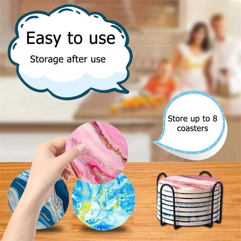 Mantar tabanlı emici malzeme Susamış seramik taştan yapılmış renkli emici seramik taş altlığı, güçlü kapasitesine sahiptir ve mobilyayı güvenli ve kuru tutmak için her türlü suyu veya sıvıyı emebilir. Arka kısım kayma direnci sağlamak için mantardan yapılmıştır. - Komple Set 8 yuvarlak masa bardak altlığı kapakları. Her bir bardak altlığı 3,9 inç çapa ve 0,2 inç derinliğe sahiptir, bu da onu sağlam ve dayanıklı kılar. Bir dirsek, bardak altlarını düzenlemenizi ve yerden tasarruf etmenizi sağlar.