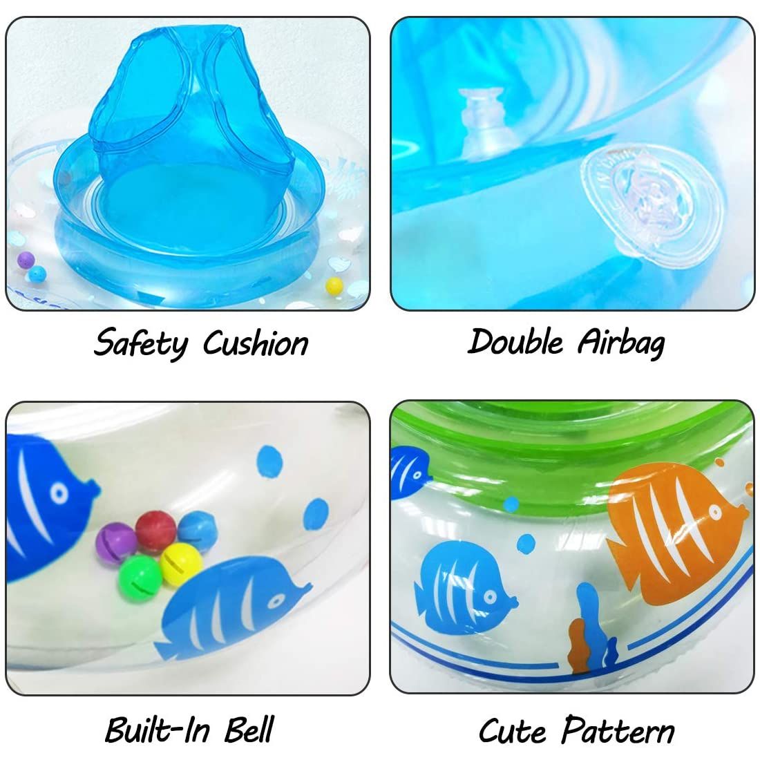Güvenli Bebek Şamandıraları Çift emniyetli şişirilmiş ağız ve çift hava odası tasarımı güvenliği sağlar. Uzatılmış ve Güçlendirilmiş yüzme koltuğu, daha düşük ağırlık merkezi, bebeğinizin yüzerken kaymasını veya dönmesini etkili bir şekilde önler. Bebeği su eğlence zamanında güvenli ve rahat tutun. - Hedef KitleBebek yüzme havuzu şamandıramız 6-12 aylık bebek için uygundur. Maksimum yük yaklaşık 24 lbs'dir, eğer bebek ağırlığı aşarsa, lütfen bir yetişkin eşliğinde kullanın. İç Çap: 8.5in. Bebekler