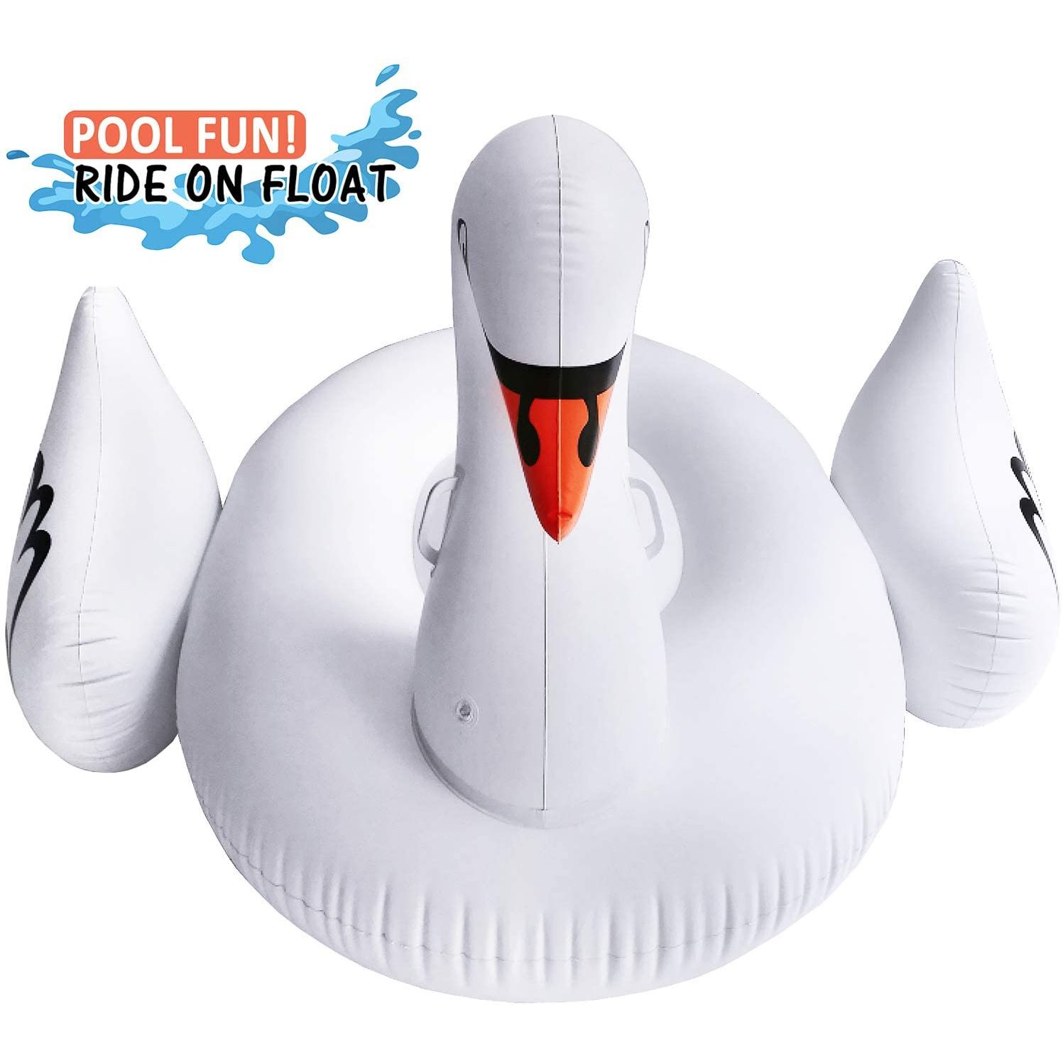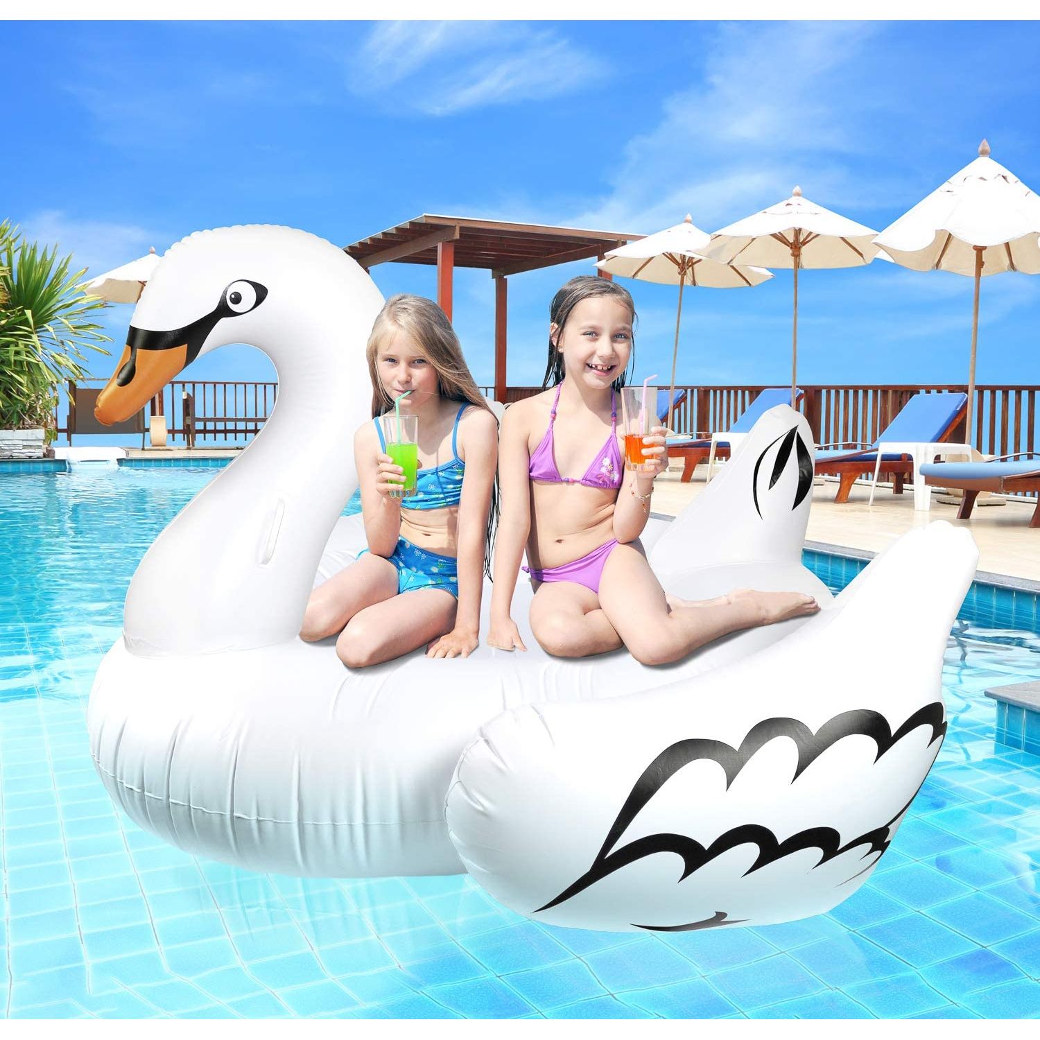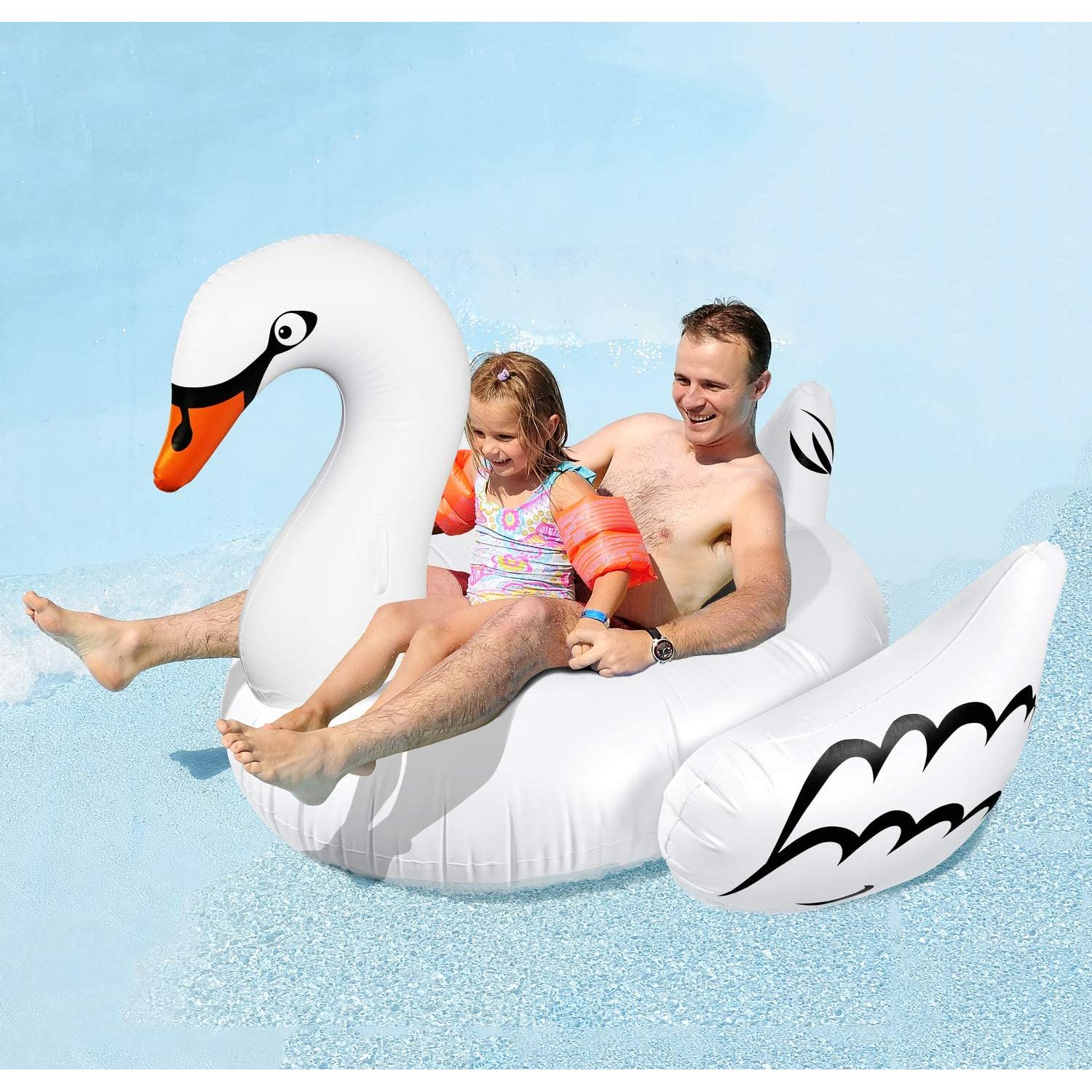 Yüksek kaliteli ağır hizmet tipi vinil PVC malzemeden yapılmış büyük şişme yüzen Kuğu - Hem çocuklar hem de yetişkinler tarafından beğenildi. Bilardo oynamak, uzanmak, havuz dekorasyonu ve havuz partileri için harika - Şişirmesi kolay, 5 hava odasına sahiptir. İyi kavrama için kuğu boynunda iki tutamak bulunur - Baştan kuyruğa 75 inç şişirildiğinde ölçüler, iki kişi için yeterli alan - Uzun ömür için bir onarım yama kiti içerir. 140 lb ağırlık kapasitesine sahiptir