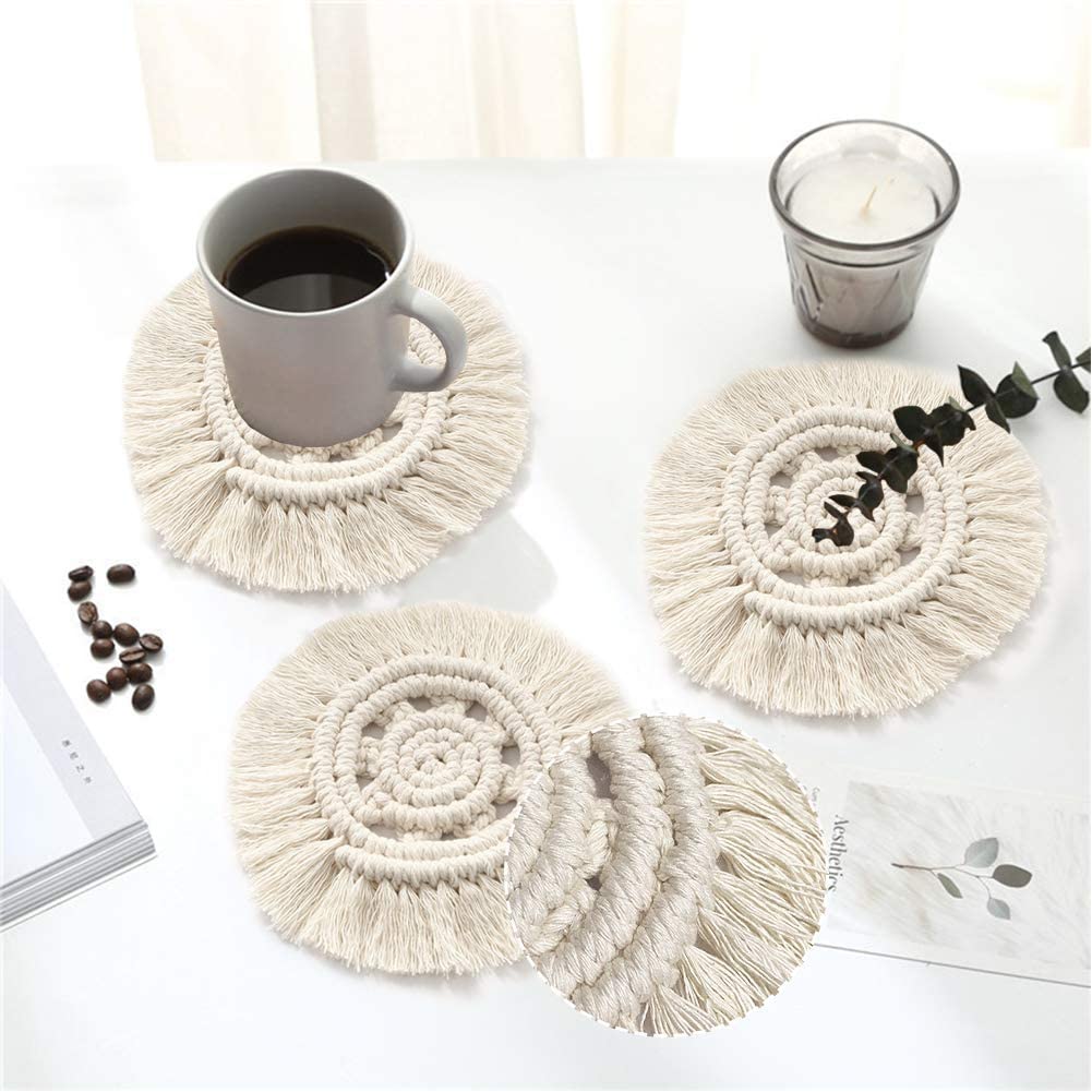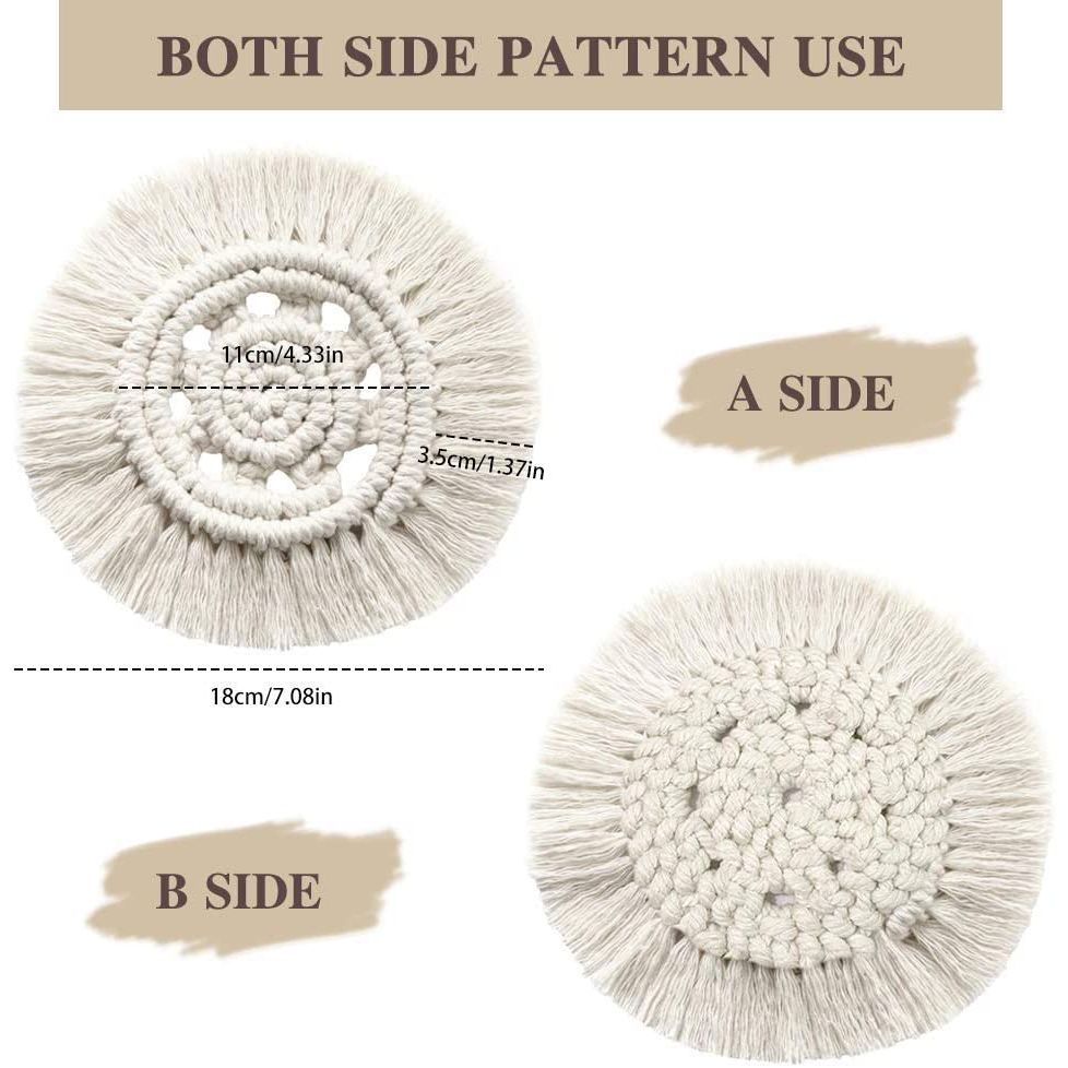 El Yapımı Sanatsal Stil Çevre Dostu pamuk ip, %100 el dokuması bardak altlıkları, şık püsküllü bardak altlıkları daha rustik ve sanatsal hale getiriyor. Her türlü ev dekorasyonuna uyum sağlar, yemek takımlarınıza ve ev dekorunuza Boho Style, Bohemian folk ve vintage kırsal anlayışı ekler. - Art of Living Makrome Dcor: AB ÇİFT YÖNLÜ DESEN KULLANIMI özelliklerine sahiptir, tüm masalarınızda, tezgahlarınızda ve mobilyalarınızda isteyeceğiniz şık ve fonksiyonel yuvarlak içecekler pamuklu ip makrome bardak altlığı seti. sen yapabilirsin.Ölçü:17.7 cm