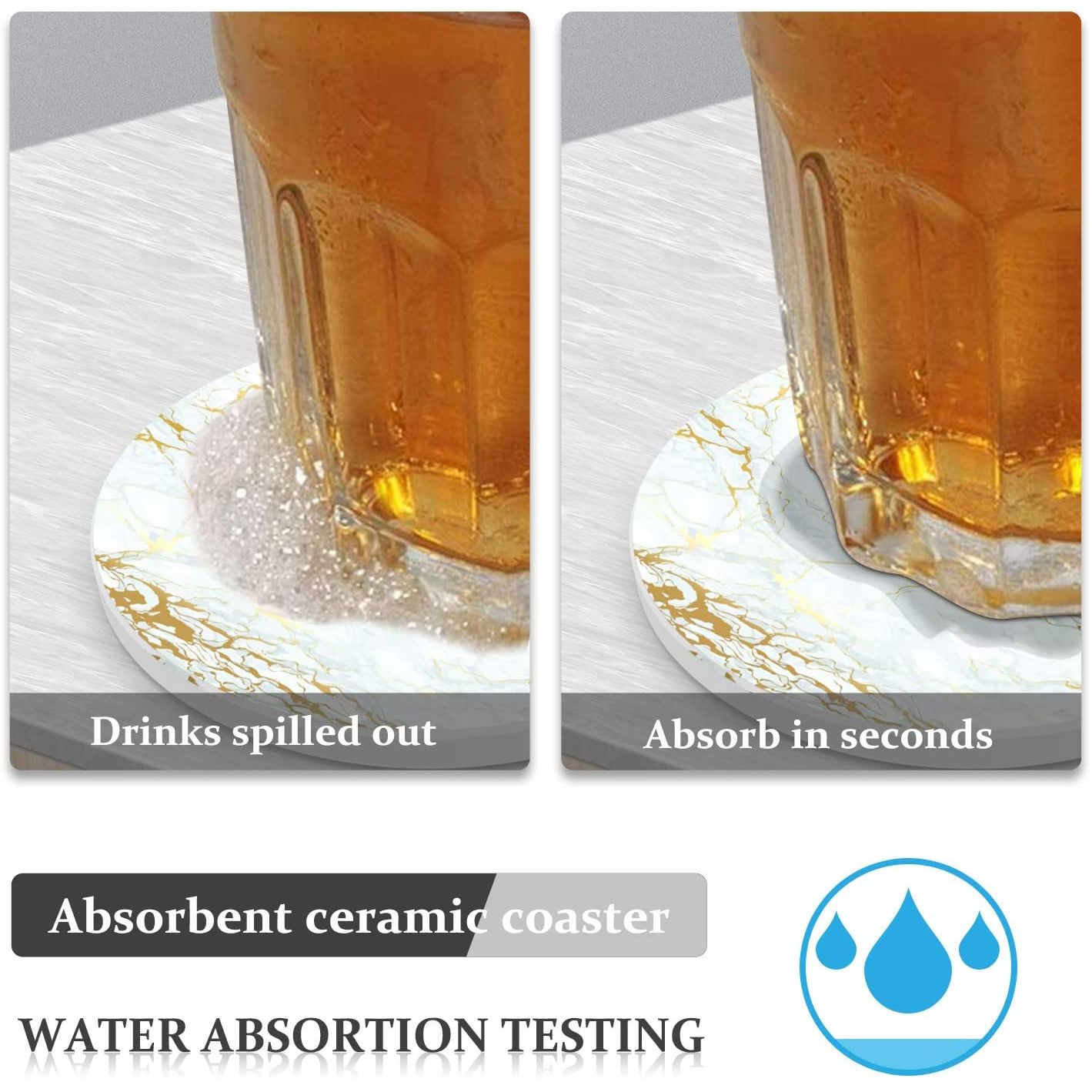 Güçlü  Beyaz mermer tarzı bardak altlığı seti, kumtaşı ve Silikon bardak altlıklarından daha emici olan özel emici seramik taştan yapılmıştır. Suyu emebilir veya lekeleri daha hızlı içebilir ve masayı kuru ve temiz tutabilir. - Kaymaz Mantar Sırt Her dekoratif içecek altlığı, mobilya üstlerini korumak için kaymaz mantar sırt ile kaplanmıştır. Porselenin masaları çizmesini önlemeye yardımcı olur ve kaymaz bir yüzey sağlar, böylece masadan kayma konusunda endişelenmenize gerek kalmaz. 10 cm.