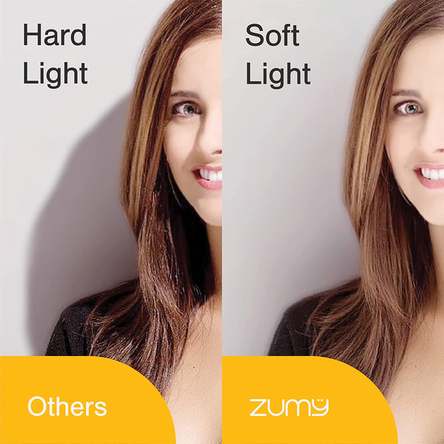 Halka ışıklar ve LED video ışıkları sert, zorlayıcı bir ışık sağlar.Bunun yerine, Zumy, ışık yorgunluğunu ortadan kaldıran ve aydınlatma yüzeyinde görünür sıcak noktalar olmayan dağınık ve yumuşak bir ışık oluşturur.