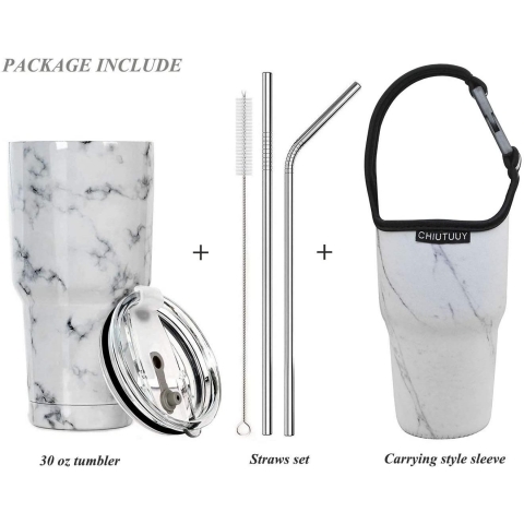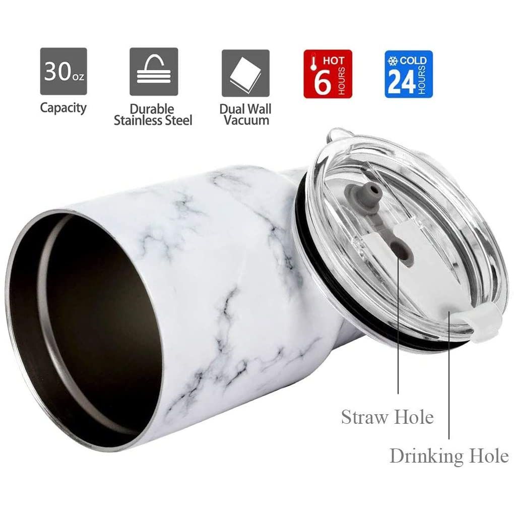 Paket İçeriği30 oz mermer beyaz bardak, iki payet, mermer baskı taşıma kılıfı, kapak ve temizleme fırçası. - Yalıtımlı Bardak18/8 gıda sınıfı paslanmaz çelikten yapılmış çift duvarlı vakum teknolojisi, içecekleri 6 saatten fazla sıcak veya soğuk tutar. - BPA Kapak ve Paslanmaz Çelik ÇubuklarEkstra sızdırmaz ve kapak kapağı maksimum su sıçramasına karşı dayanıklı ve güvenli kullanım sağlar. Daha rahat bir yudum için üstte içme deliği ve pipet deliği. - Yeniden Kullanılabilir Bardak KılıfNeopren, yumuşak, hafif,