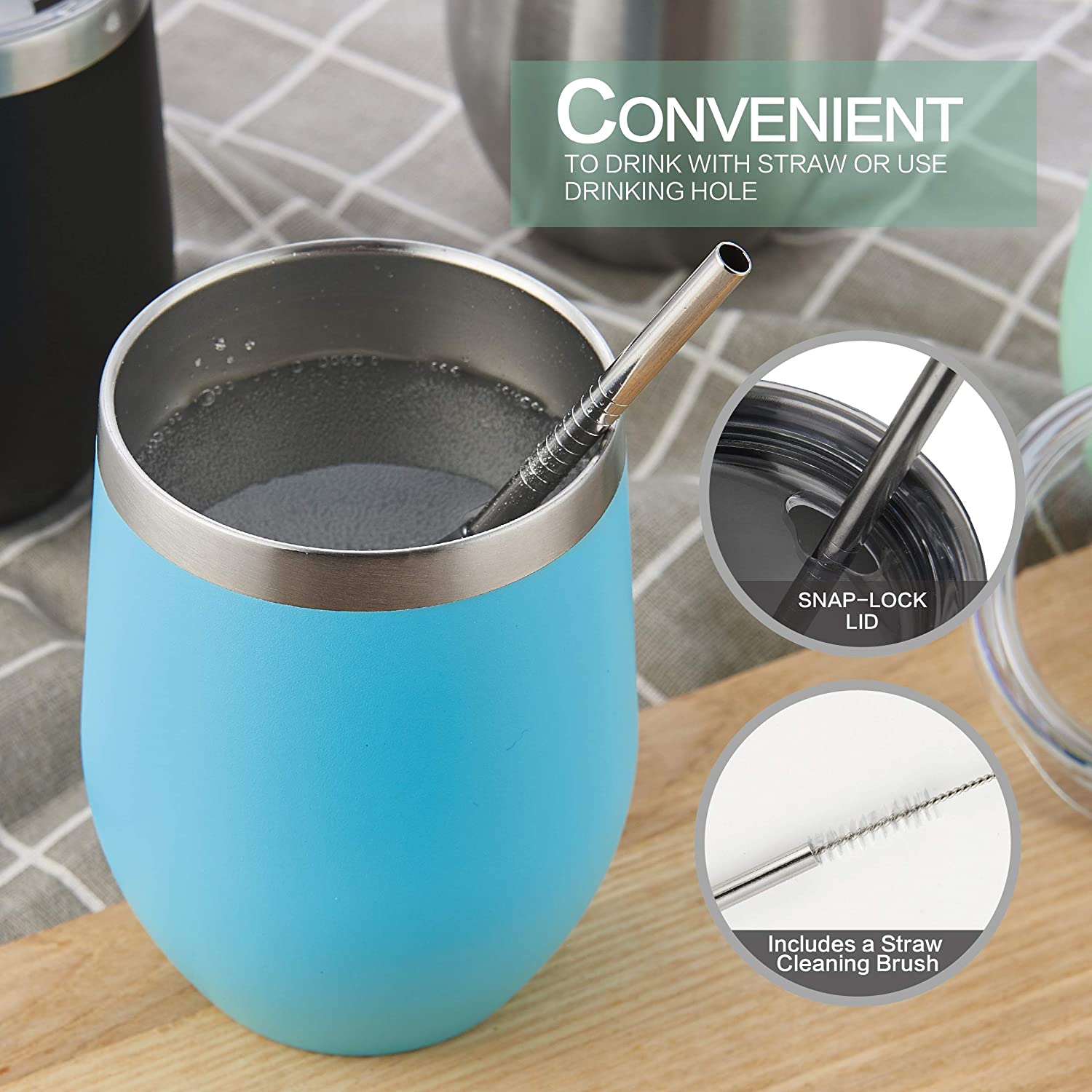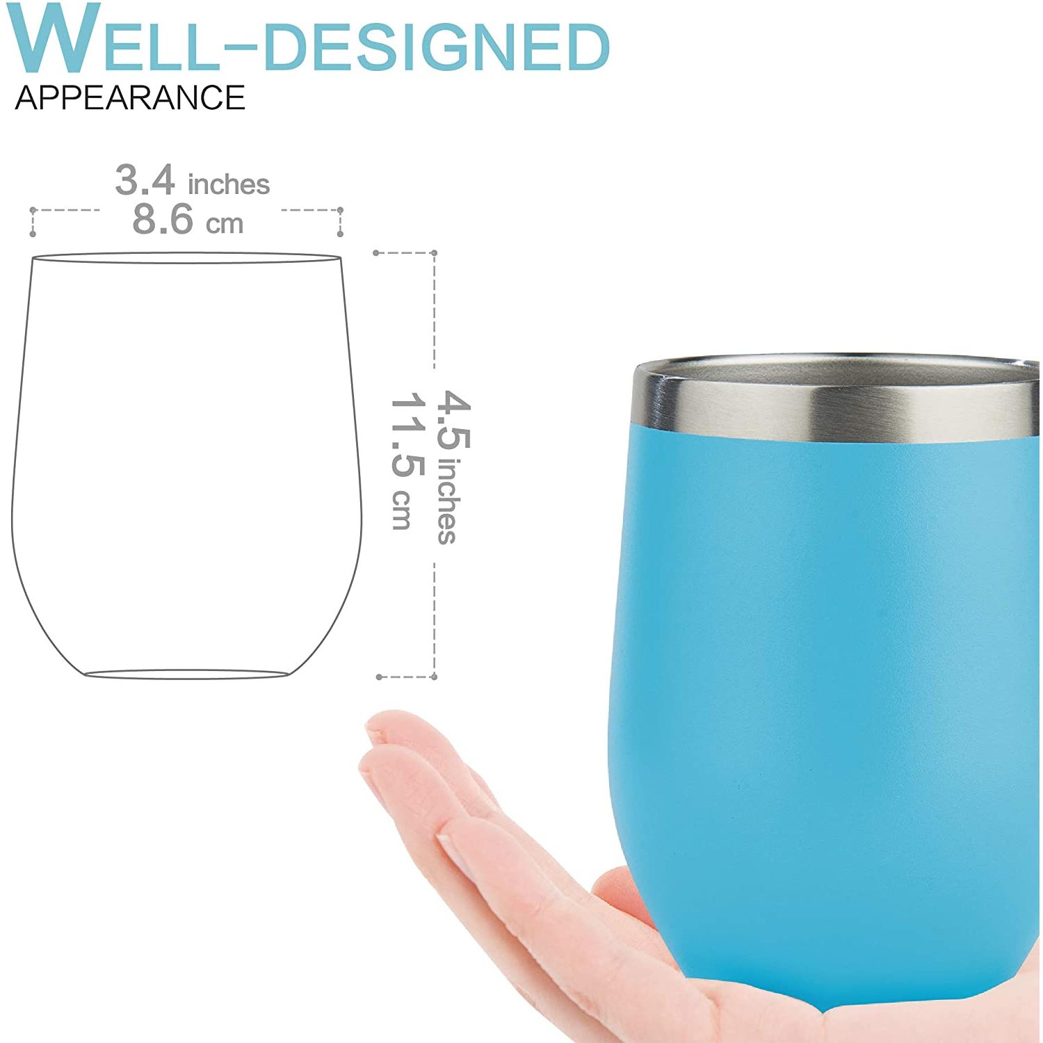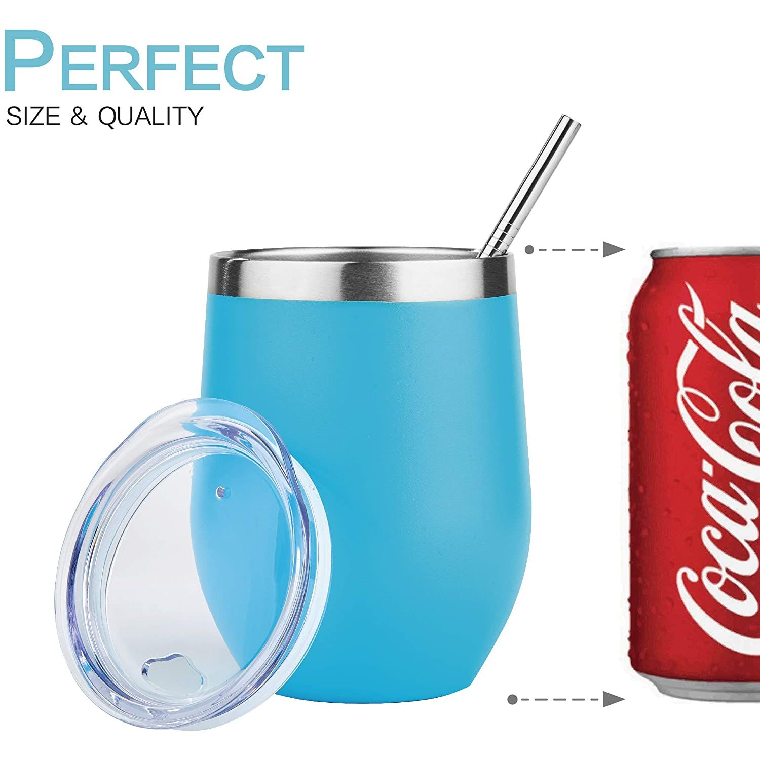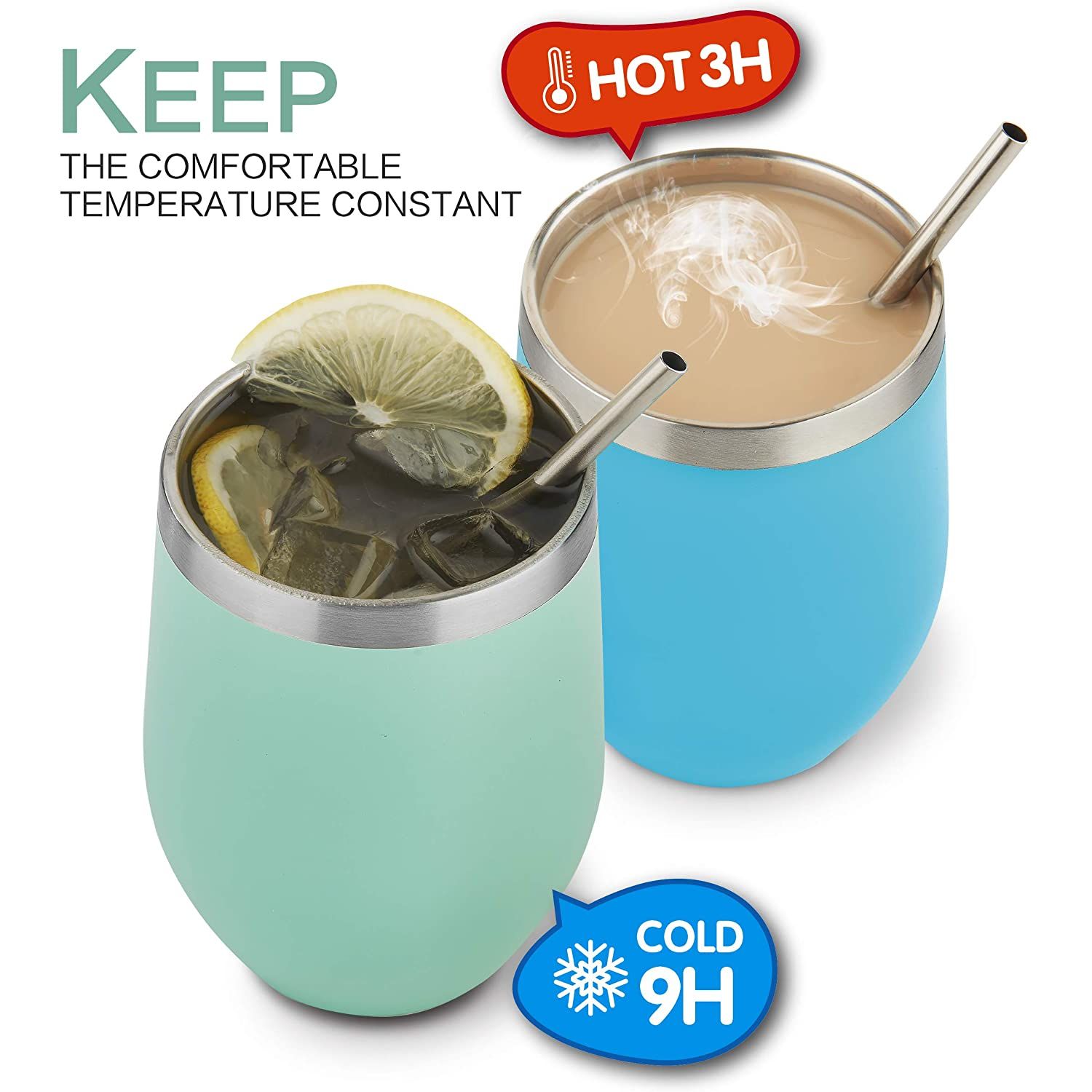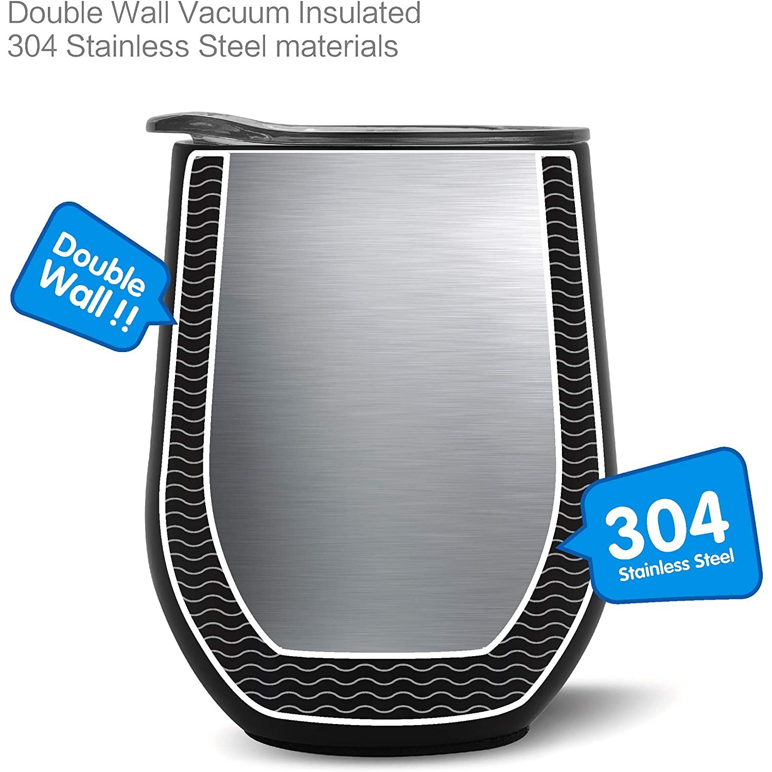 YÜKSEK KALİTE - 18/8 hafif, kurşunsuz paslanmaz çelikten yapılmıştır, üst rafta bulaşık makinesinde yıkanabilir ve tatları değiştirmez veya kimyasalları sızdırmaz, BPA ve toksin içermez. - ÇİFT CİDARLI VE VAKUM YALITIMLI ŞARAP TUMBERİ - İçeceğinizi 9 saate kadar soğuk, içeceğinizi 3 saate kadar sıcak tutar, terletmez, yoğuşma yapmaz. - 12 OZ HOLDS - Stemless 12 oz tutar, bu da onu şarap, kokteyller, çay, sangria ve daha fazlası için mükemmel bir boyut haline getirir. Pikniklere veya partilere götürün, bu yeniden kullanılabilir seyahat kupası