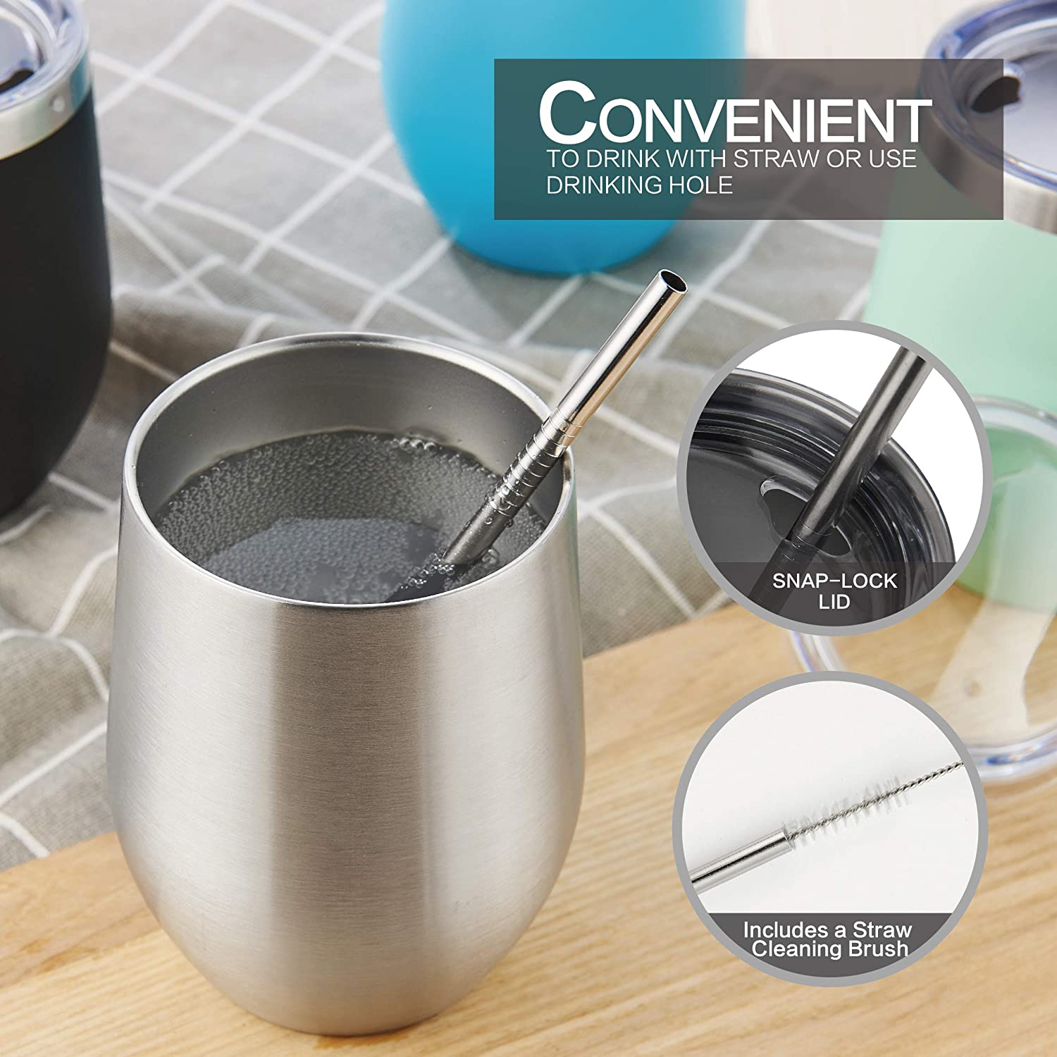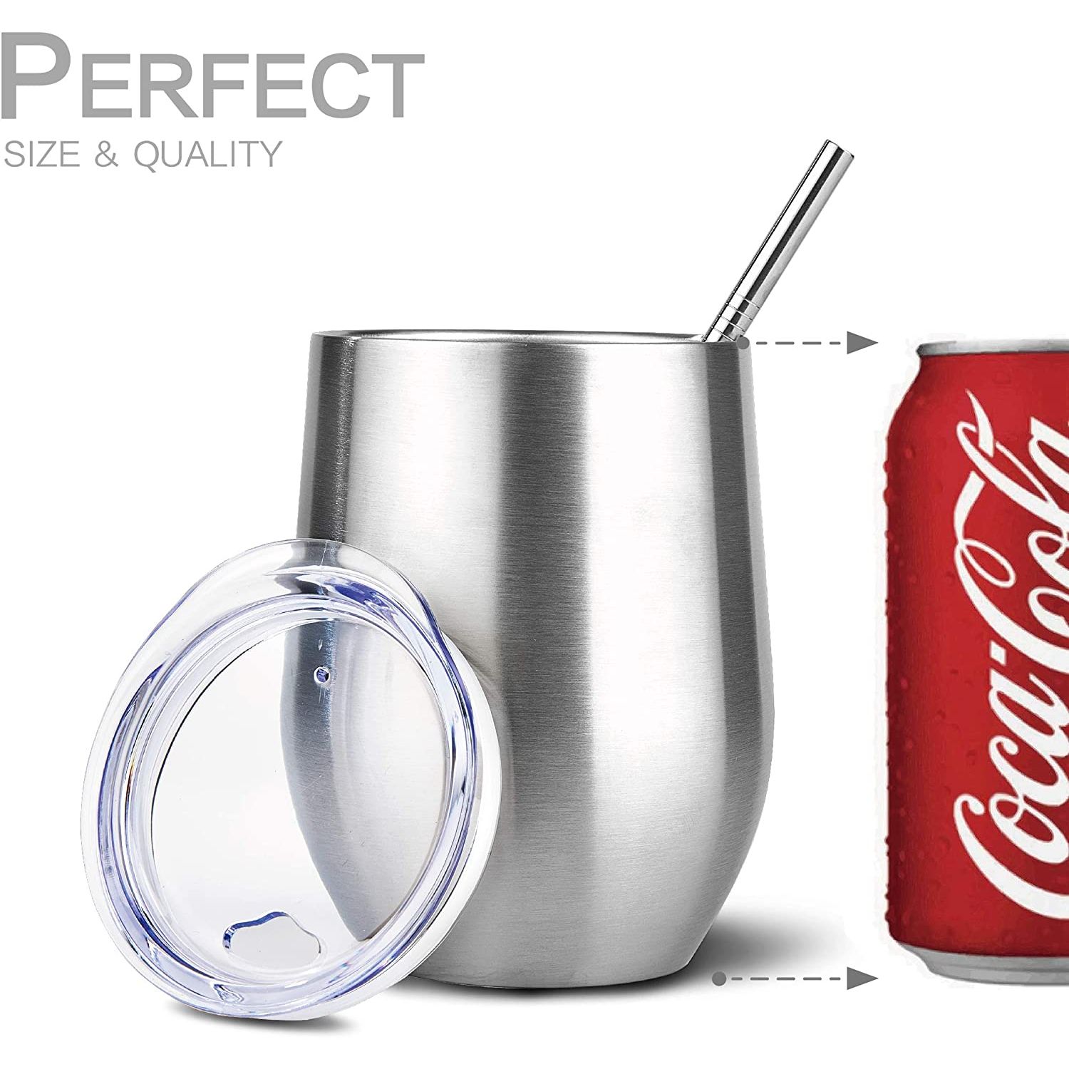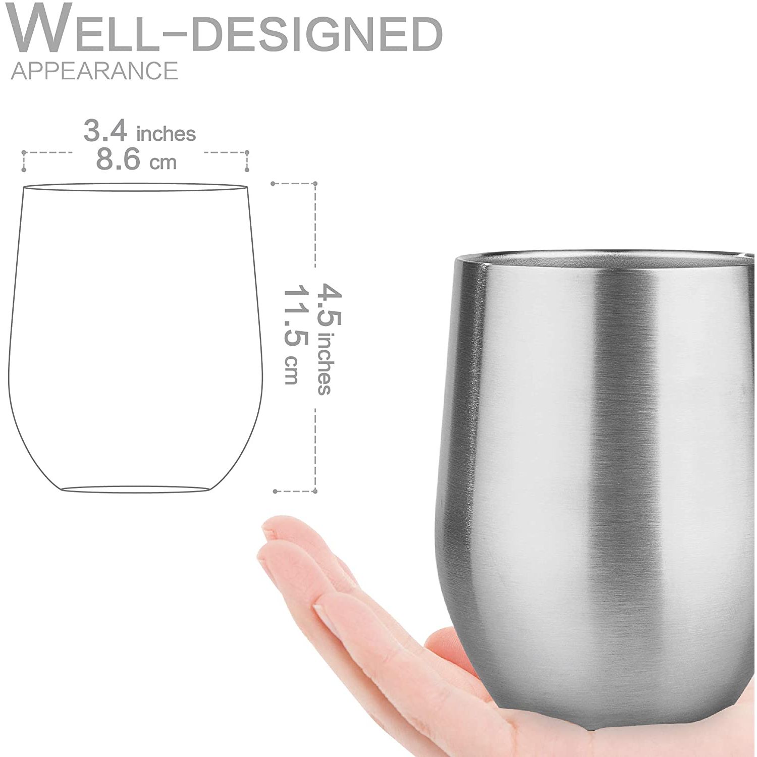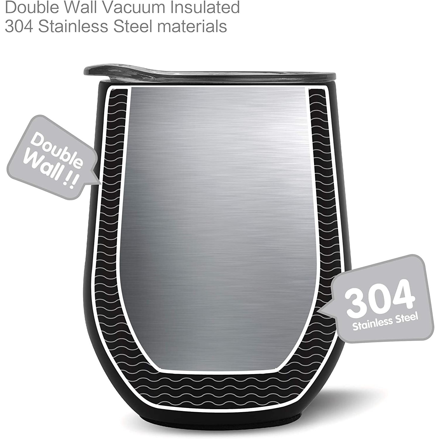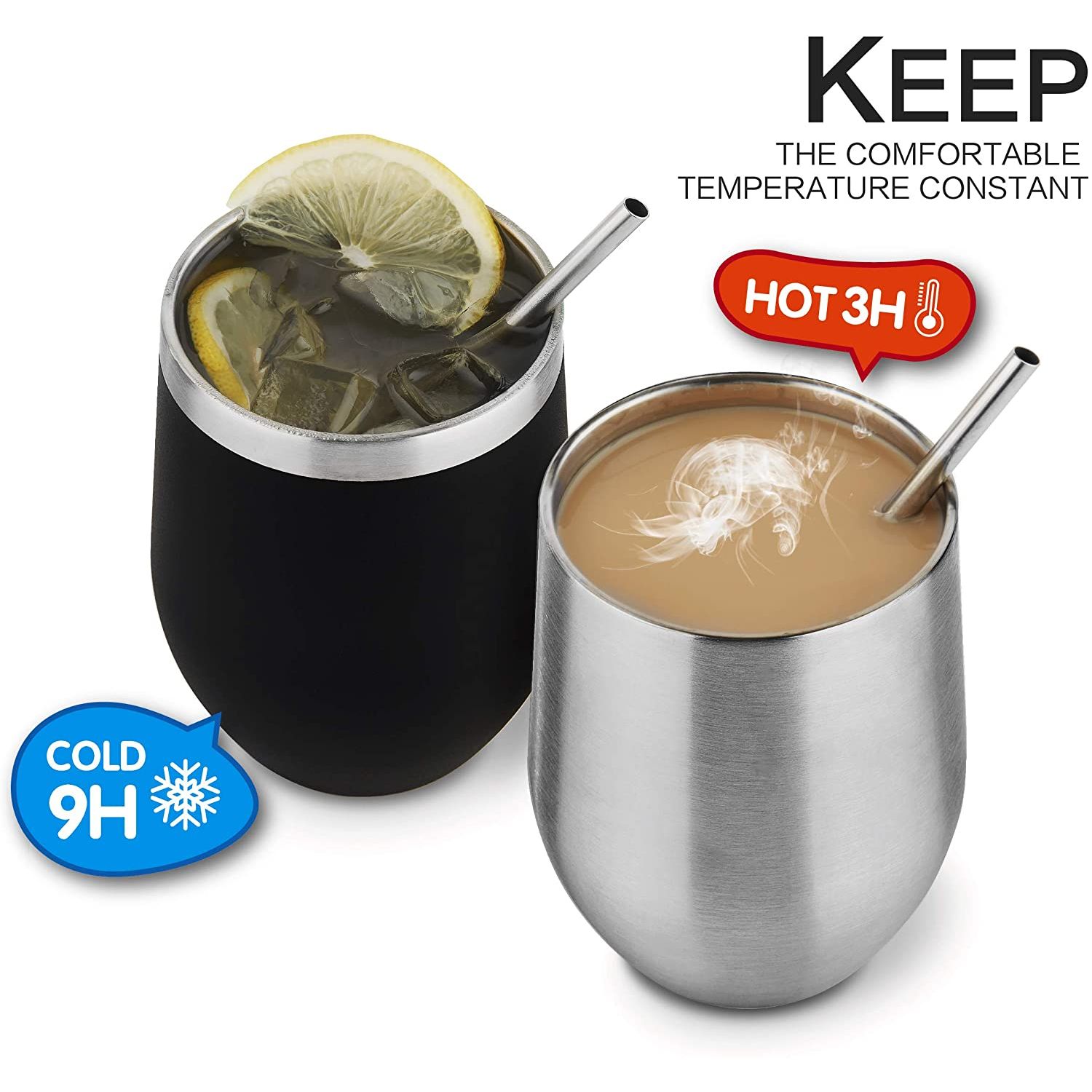 YÜKSEK KALİTE - 18/8 hafif, kurşunsuz paslanmaz çelikten yapılmıştır, üst rafta bulaşık makinesinde yıkanabilir ve tatları değiştirmez veya kimyasalları sızdırmaz, BPA ve toksin içermez. - ÇİFT CİDARLI VE VAKUM YALITIMLI ŞARAP TUMBERİ - İçeceğinizi 9 saate kadar soğuk, içeceğinizi 3 saate kadar sıcak tutar, terletmez, yoğuşma yapmaz. - 12 OZ HOLDS - Stemless 12 oz tutar, bu da onu şarap, kokteyller, çay, sangria ve daha fazlası için mükemmel bir boyut haline getirir. Pikniklere veya partilere götürün, bu yeniden kullanılabilir seyahat kupası