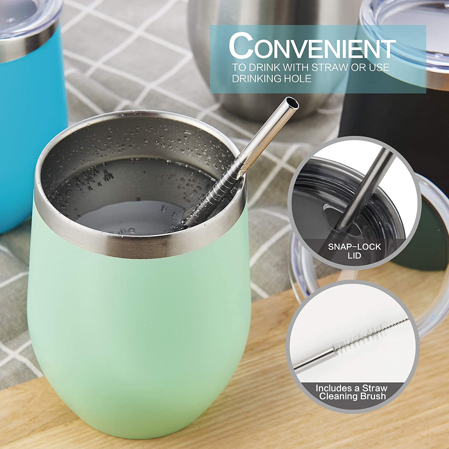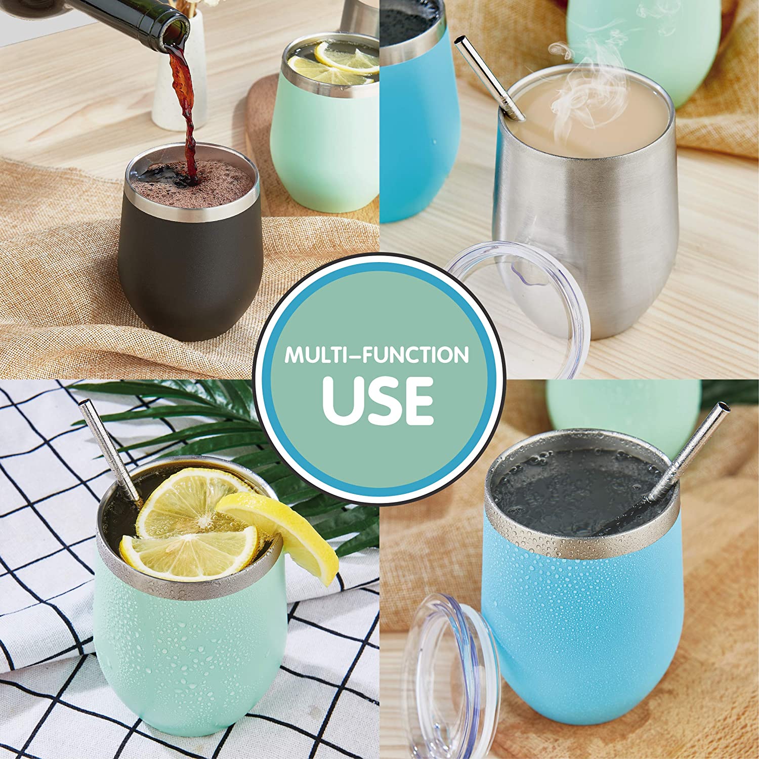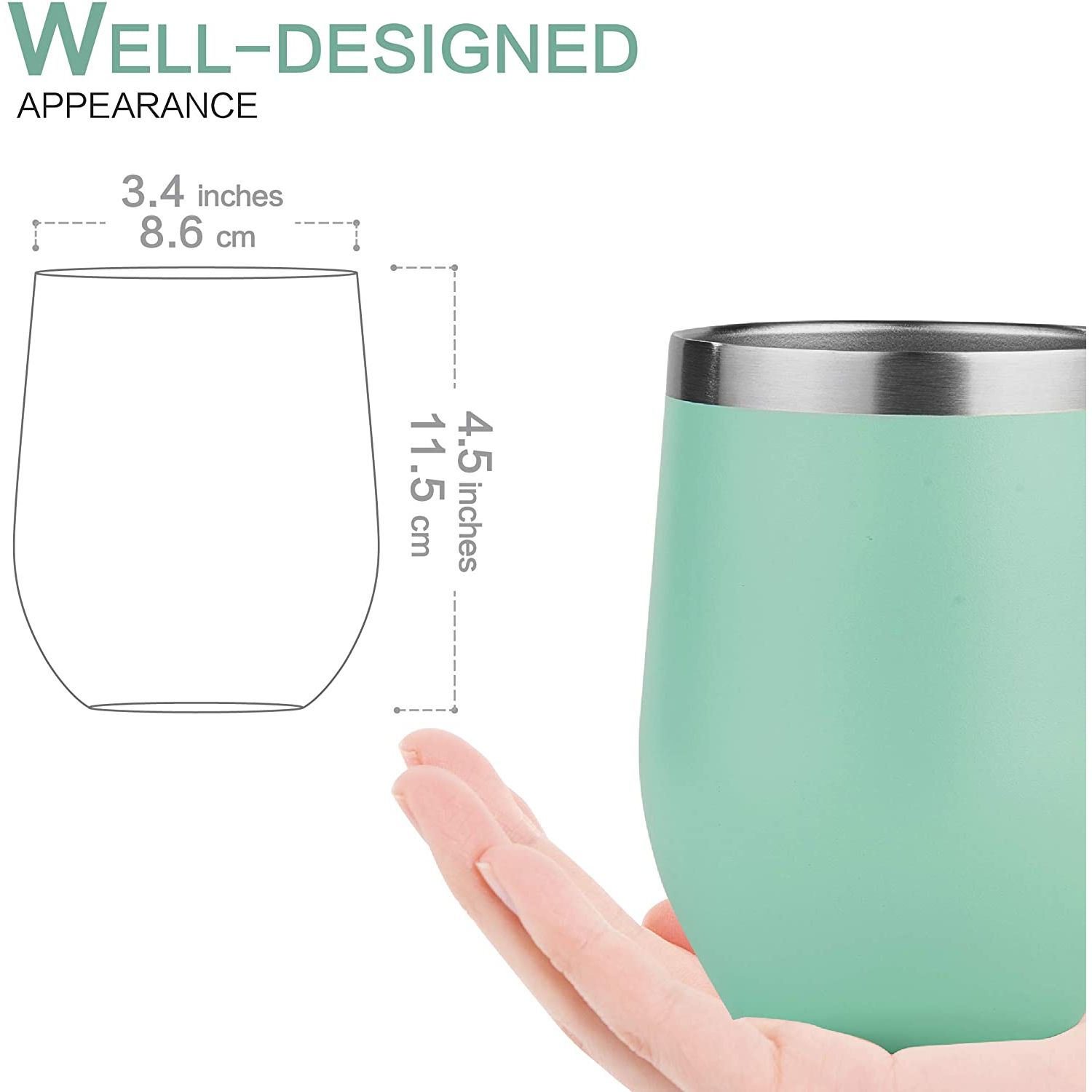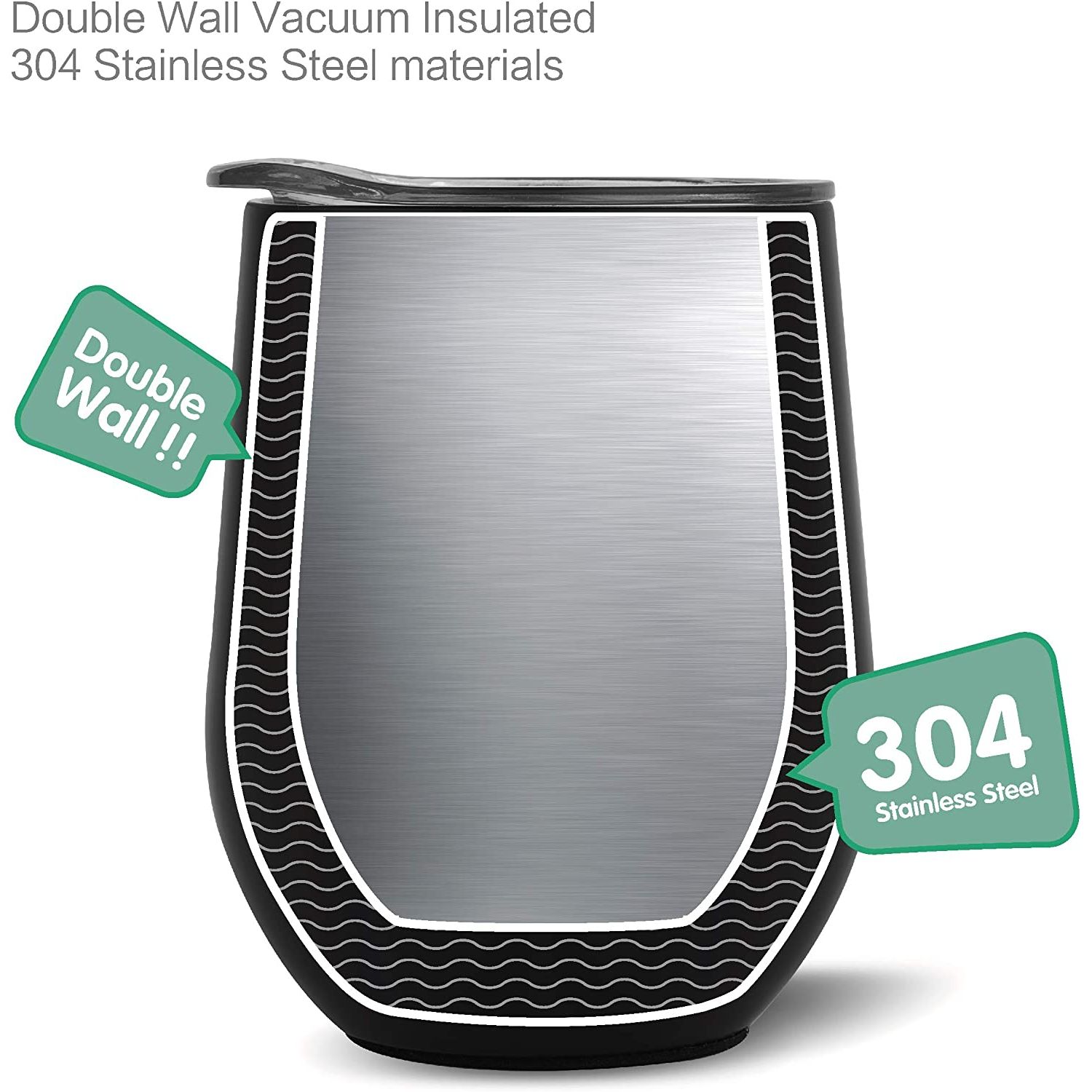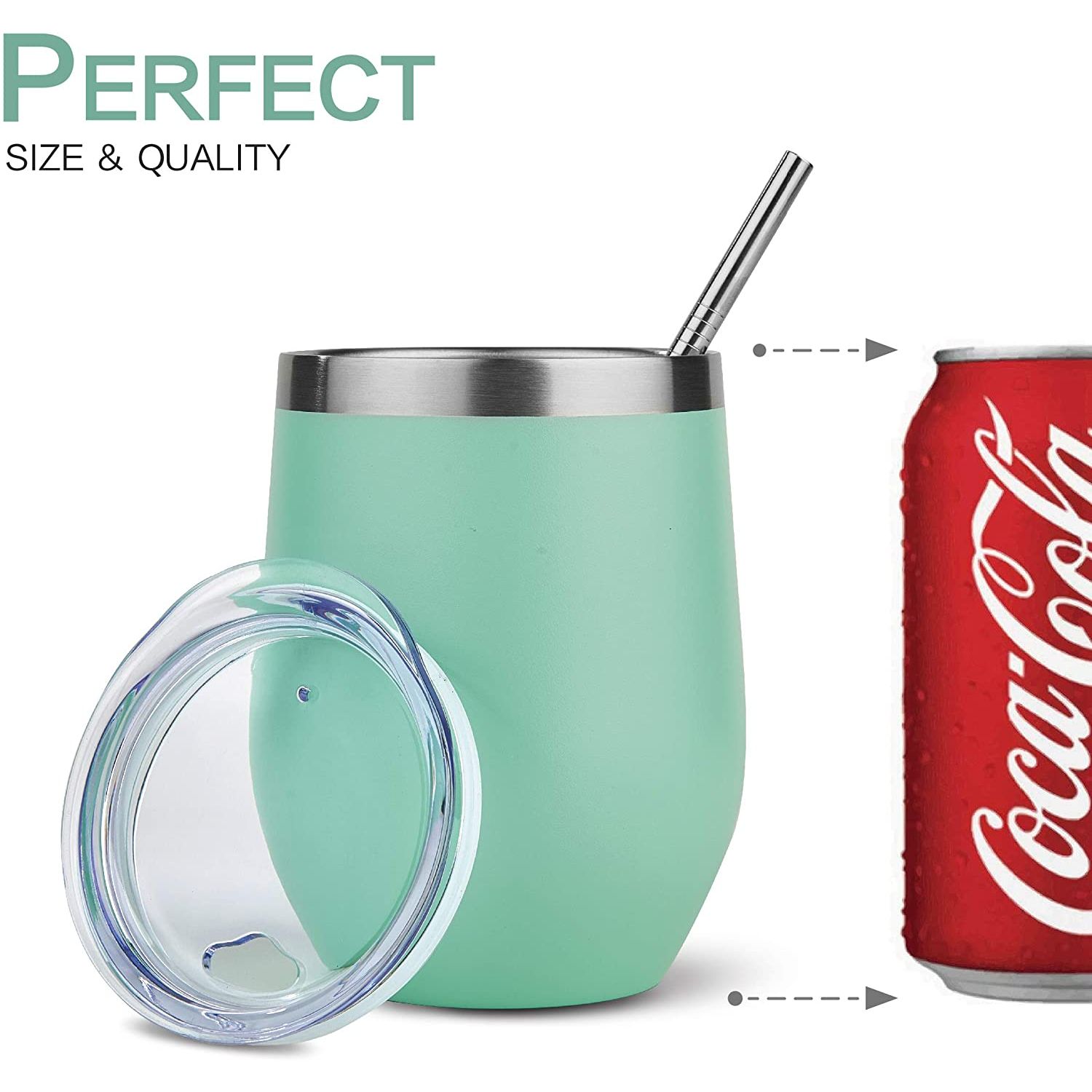 YÜKSEK KALİTE - 18/8 hafif, kurşunsuz paslanmaz çelikten yapılmıştır, üst rafta bulaşık makinesinde yıkanabilir ve tatları değiştirmez veya kimyasalları sızdırmaz, BPA ve toksin içermez. - ÇİFT CİDARLI VE VAKUM YALITIMLI ŞARAP TUMBERİ - İçeceğinizi 9 saate kadar soğuk, içeceğinizi 3 saate kadar sıcak tutar, terletmez, yoğuşma yapmaz. - 12 OZ HOLDS - Stemless 12 oz tutar, bu da onu şarap, kokteyller, çay, sangria ve daha fazlası için mükemmel bir boyut haline getirir. Pikniklere veya partilere götürün, bu yeniden kullanılabilir seyahat kupası.