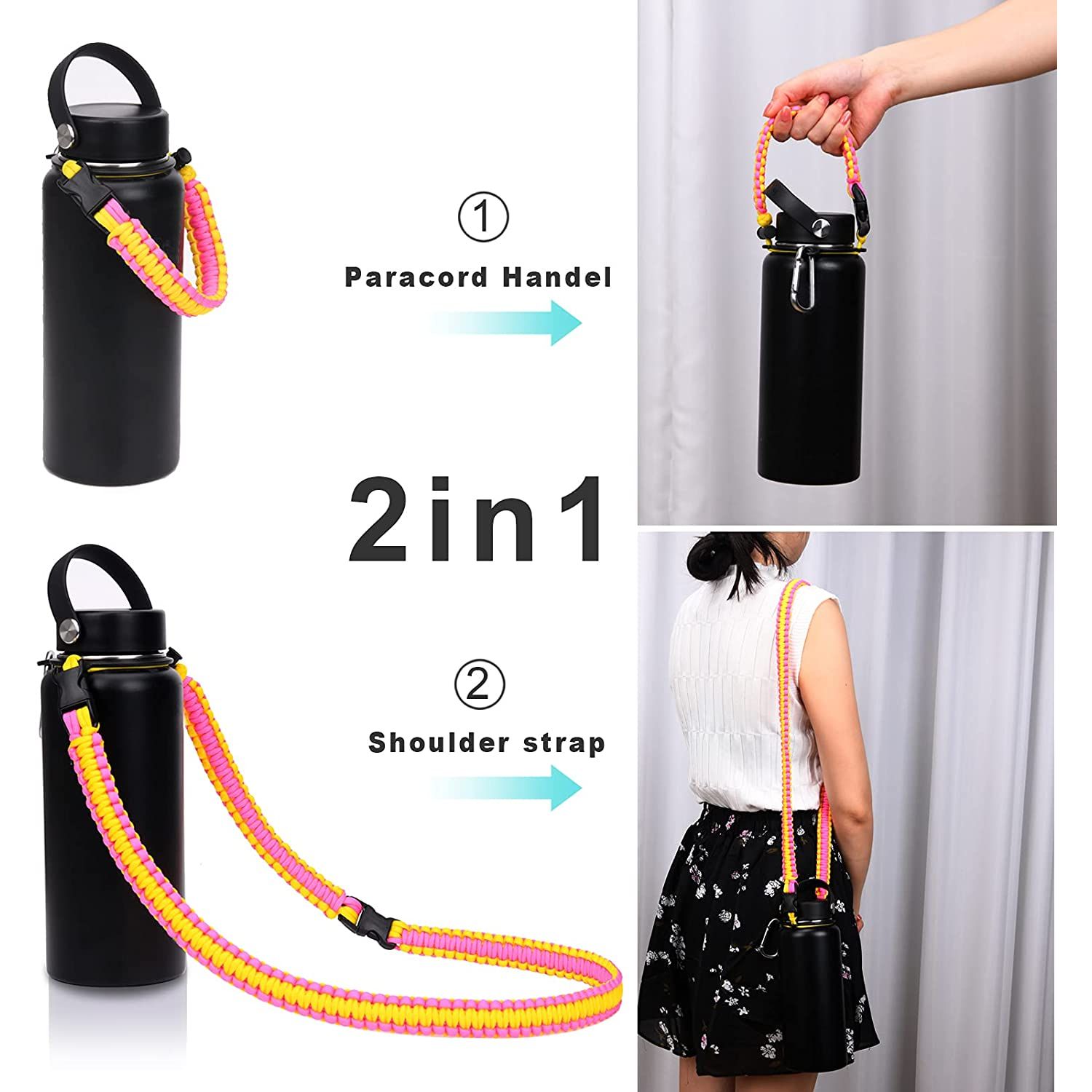 EN GENİŞ AĞIZLI ŞİŞELERE UYARGeniş ağızlı 12,16,18, 20, 24, 32 ve 40 oz su şişesi ile uyumludur Hydro Flask, Nalgene, Nathan, Klean Kanteen Mira, ThermalFlask su şişesi ve diğer geniş ağızlı şişelerle uyumludur (Not: Geçmeli halkamız HydroFlask 2.0 ile UYUMLU DEĞİLDİR, SADECE metal dudaklı şişeler için). - Yeni Tasarım: Bu su şişesi askısı, Paracord Sap ve uzun omuz askısı içerir. Şişenizi taşımanın rahat ve kullanışlı bir yolu. Omuza takın veya sadece elde taşıyın.