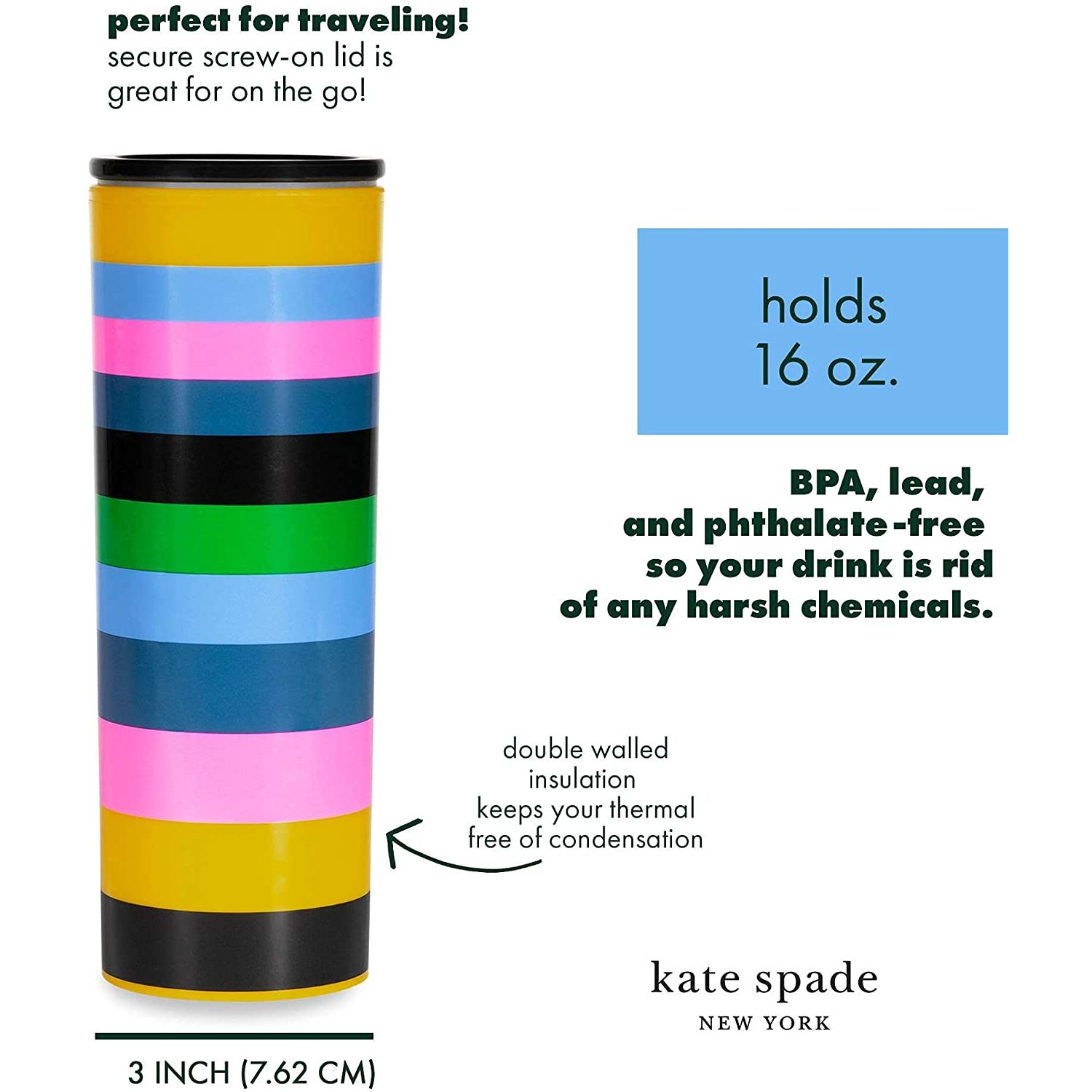 Çift Duvar Yalıtımı - Bu sevimli seyahat kupası 16 ons (473ml) tutar ve hem sıcak hem de soğuk içecekler için uygundur. Yalıtımlı bardak, içindekileri sıcak/soğuk tutan ve bardağınızı yoğuşmadan koruyan çift cidarlı bir tasarıma sahiptir. - Seyahat Dostu - Seyahat bardağı, taşıması kolay ve çoğu standart bardak tutucuya uyan ince bir tasarıma sahiptir. Kilitli kapak, kolayca açılıp/kapanır ve karışıklık olmadan işe gidip gelmeyi sağlar. - Kolay Bakım - 3 inç (7,6 cm) açıklık, kolayca doldurmak için alan sağlar.