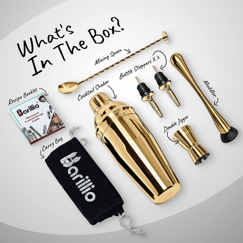 BARILLIO GOLD BARTENDING KİTİ TÜM İHTİYAÇLARINIZA CEVAP VERİYOR! Leziz kokteylleri karışıklık ve karışıklık olmadan karıştırmak için ihtiyacınız olan en temel ev bar aksesuarlarını sağladık: içecek çalkalayıcı, mojito muddler, bar kaşığı, jigger ve 2 likör dökücü - MUHTEŞEM ALTIN AYNA KAPLAMASI Altın kaplama barmen çalkalayıcı tenekesi kalınlaştırıldığından emin olun. kırılmayacak, bükülmeyecek veya paslanmayacaktır. Barware alet takımınızı ılık, sabunlu suyla elde yıkayarak iyi bir şekilde tedavi edin - ve yıllarca sürecek. -