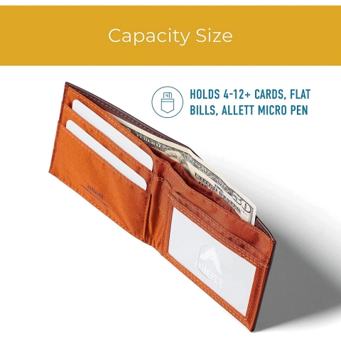 ÖZELLİKLER VE KAPASİTE: 4-12+ kart ve düz fatura tutar. Bu orta kapasiteli cüzdan, kimliğiniz için şeffaf bir cebe ve nakit para için iki bölmeye sahiptir. Bu, klasik bifolda ince bir alternatiftir. Cebinde zar zor fark edilen bu cüzdan, size rahat bir cüzdan deneyimi yaşatmak için tasarlandı. - RFID HIRSIZLIK KORUMASI: RFID kaymağının kurbanı olmak bir acıdır. Bu hırsızlık türü, uzaktan kredi kartı ve pasaport bilgilerini yakalamak için yüksek frekanslı tarayıcılar kullanır. Allett RFID engelleme duvarı bulunur.