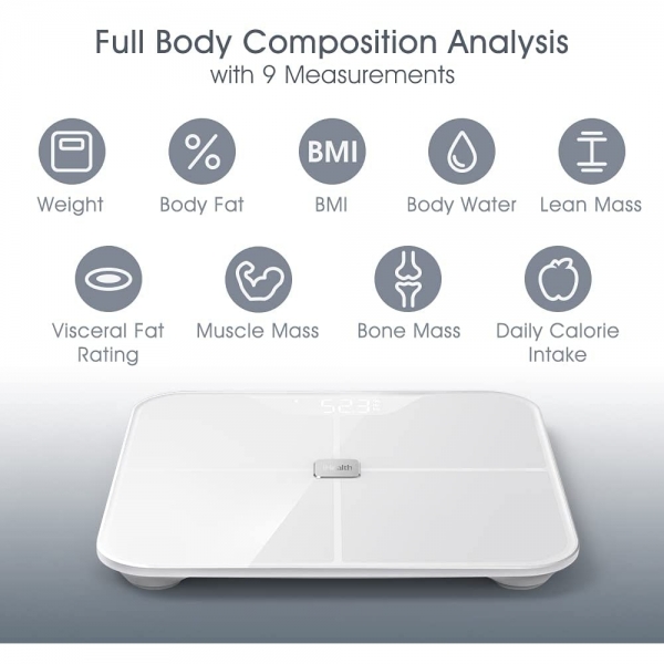 Gelişmiş BIA (biyoelektrik empedans analizi) algoritması ile entegre edilmiş dört süper hassas G-şekilli sensör, ağırlığınızın 0,2 pound'unda doğruluk sağlar.