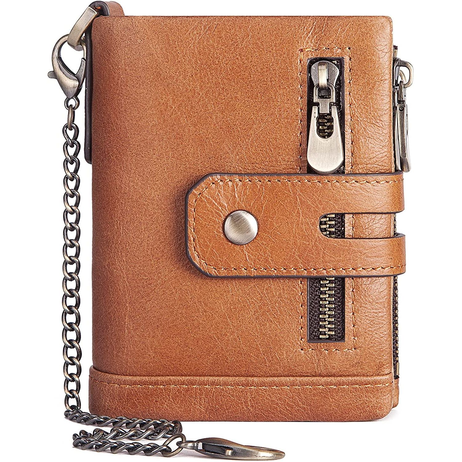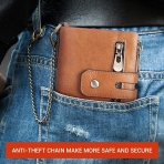 Erkekler için Zincir Cüzdanlar. Son derece yumuşak ve dayanıklı Hakiki deriden (%100 yepyeni, orijinal ve yüksek kalite) yapılmıştır. Pürüzsüz dokusu, günlük kullanım için mükemmel, zarif bir çift katlı cüzdan yapar. Bu erkek cüzdanı, nerede olursanız olun en iyi beyefendi gibi görünmeniz için yüksek moda ve tasarım stili göz önünde bulundurularak yapılmıştır. - Yüksek kapasiteli. Bu erkek cüzdanı 1 inç kalınlığında ve sadece 4,5 inç x 3,5 inç ölçülerindedir. Kart sahibi*18; Banknot Bölmesi*2; Kimlik Penceresi*2; fermuarlı kese bulunur.