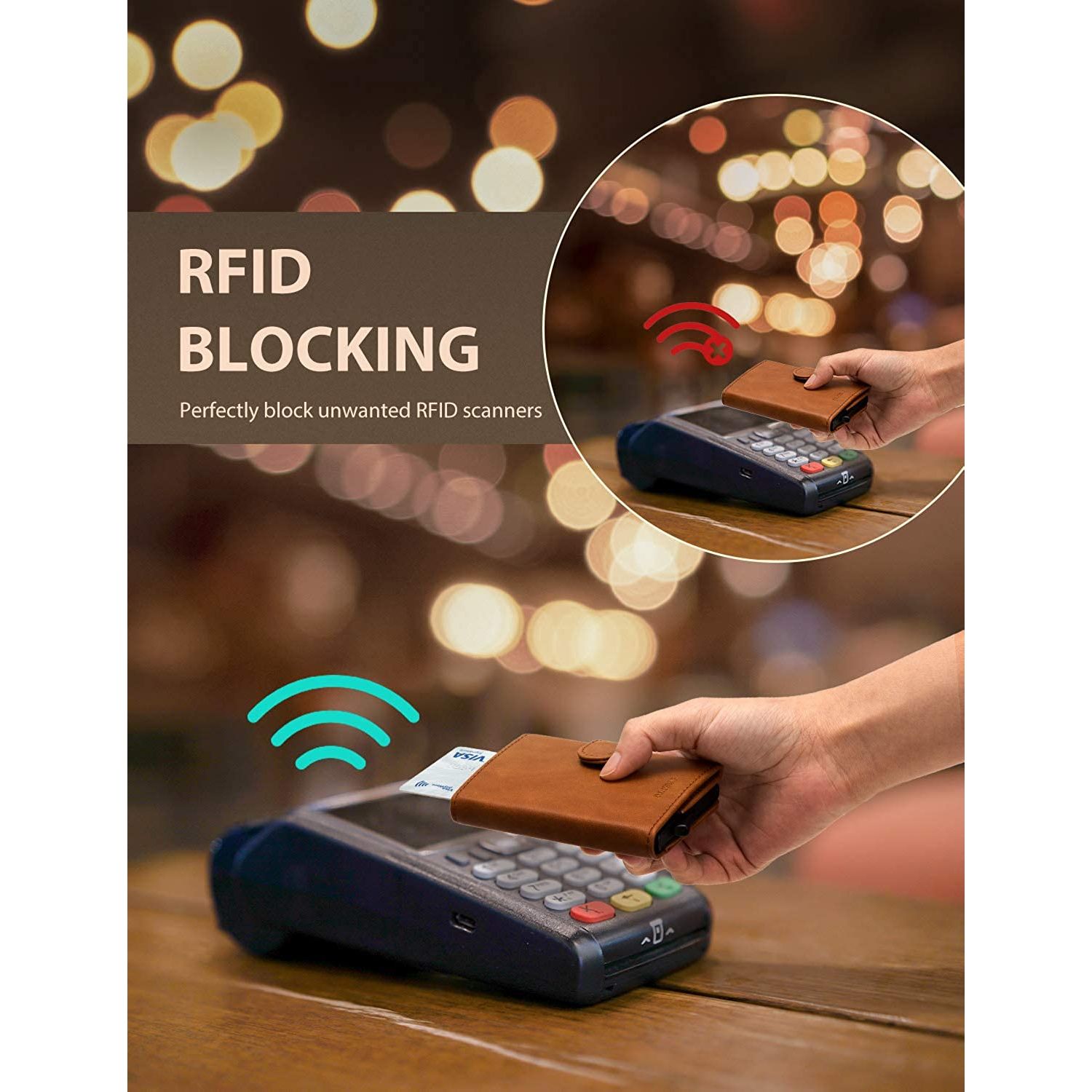 Deri astar - Alüminyum kredi kartı sahibi 5 kart saklayabilir. Cüzdan kısmında, küçük nakit veya faturaları tutmak için bir bölmeye sahip 8 kart alanı daha vardır. - Kolun üzerinde kaydırdığınızda kartınıza Hızlı Erişim, kartlar kademeli bir şekilde açılır. - RFID engelleme koruma tasarımı, özel bilgilerinizi ve kredi kartınızı hırsızların tarama cihazlarından uzak tutun, özel mülk güvenliğinizi sağlayın. - Kaliteli çılgın at derisinden yapılmıştır. Dayanıklı, benzersiz görünüm ve dokunuşa yumuşak.