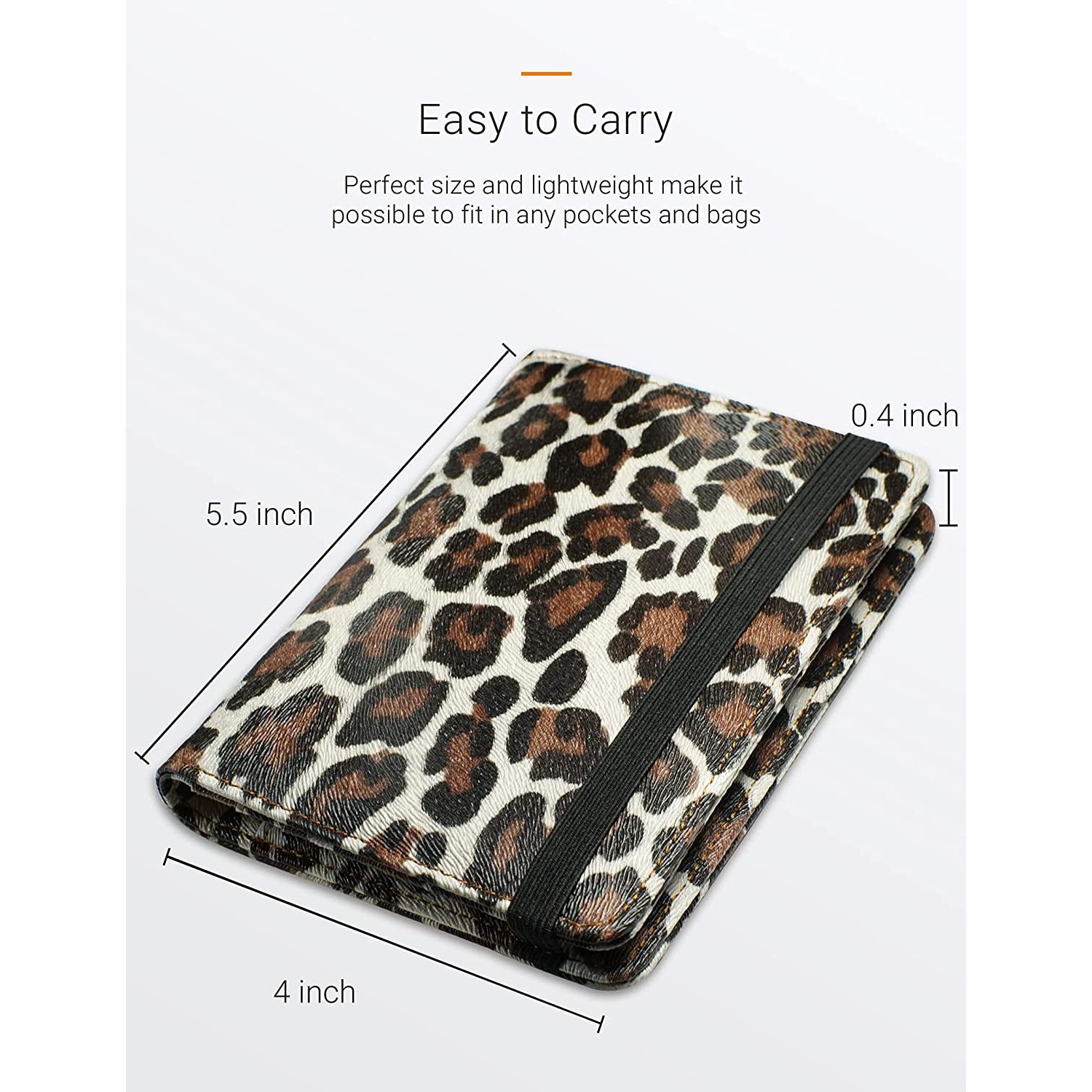 Mükemmel boyut ve Hafiflik: (4" X 5.5", 2.3oz) çok hantal veya büyük olmadığı için mükemmel, sadece standart ABD pasaportuna sığacak kadar büyük ve her yere götürebileceğiniz bir sırt çantası veya çantaya sığacak kadar ince. - Saygın Dikiş ve Göz Alıcı Tasarım: Yüksek kaliteli PU deriden yapılmıştır, dışarı sarkan hiçbir ip yoktur, her şey sıkıca dikilir ve elinizde çok iyi hissettirir. Leopar deseni son derece şık görünüyor. - İşlevsel: Tüm ihtiyaçlarınız için içeride fazlasıyla yeterli depolama alanı