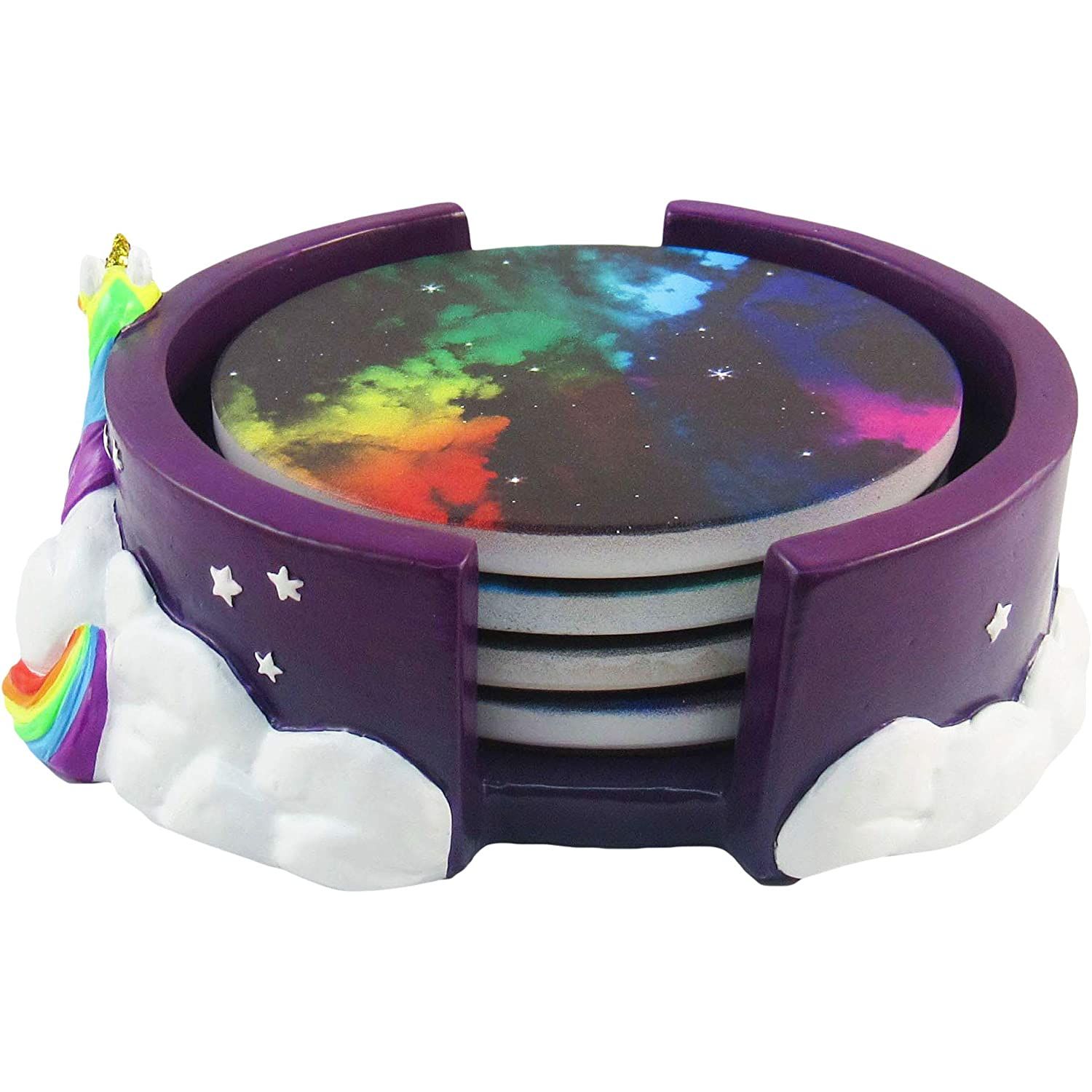 KOLEKSİYON - Gökkuşağının her renginden ilham aldı! Bu büyülü, elle boyanmış altlık arabası, yalnızca World of Wonders tarafından yaratılan ve yalnızca World of Wonders'tan alınabilen, koleksiyonluk Unity serisinden gökkuşağı yeleli, altın boynuzlu, her şey dahil Unity the Unicorn'a sahiptir. - MUHTEŞEM - Bu muhteşem, türünün tek örneği aksan parçası, tümü yüksek kaliteli mantar destekli seramikten yapılmış dört dekoratif fantezi evren bardak altlığı ile birlikte gelir. Sehpanızın ve mobilyanızın harika görünmesini sağlayın ve herhangi bir odayı baştan yaratın.