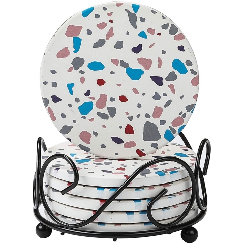 TERRAZZO LIGHT DESIGN Bu set, piyasadaki diğer emici bardak altlıklarından ayıran ve sehpanıza veya bar tezgahınıza benzersiz bir atmosfer getiren Terrazzo Light desenlerinde Tutuculu 6 adet yuvarlak seramik taş bardak altlığı içerir - MÜKEMMEL BOYUT - 4.06" yuvarlak Doğal Seramik Taş Bardak altlıkları her tür bardak, fincan ve kupa için mükemmel boyuta sahiptir, harika bir bar aksesuarı veya ev masası dekoru olabilir.