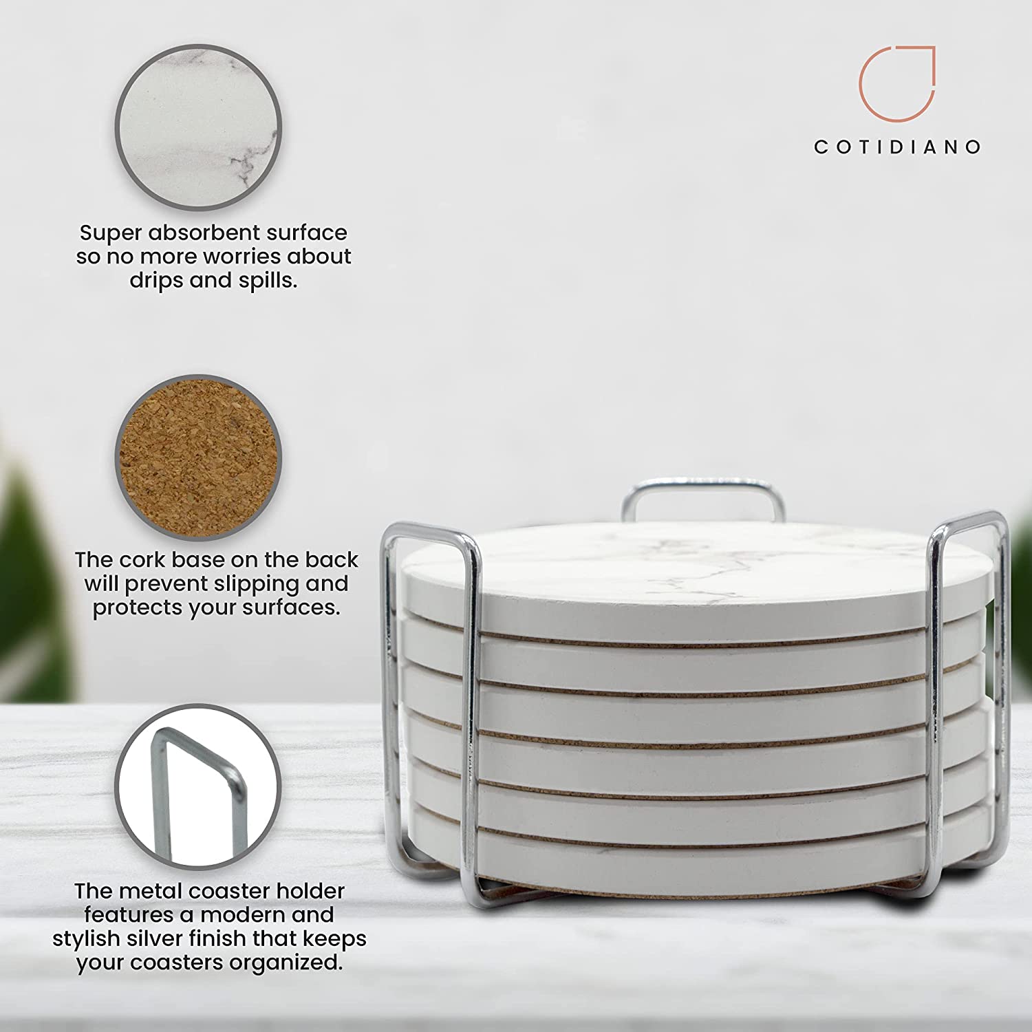 6'LI SET - Yuvarlak bardak altlıkları, gümüş bir metal bardak altlığı tutucusuna yerleştirilebilen 6'lı bir set halinde gelir. - İNANILMAZ BİR ŞEKİLDE EMİCİ - Bardaklarımız nemi, soğutulmuş bardaklardan teri emebilen, damlayan ve dökülen yüzeyleri temiz ve kuru tutmanıza yardımcı olan gözenekli bir seramik yüzeye sahiptir. - KAYMAZ MANTAR TABAN - Altlıkların arkasındaki mantar taban, içecekleri ve bardakları yerinde tutarken kaymayı önleyecek ve mobilyalarınızı çizilmelere karşı koruyacaktır. - GÜMÜŞ TUTUCU -