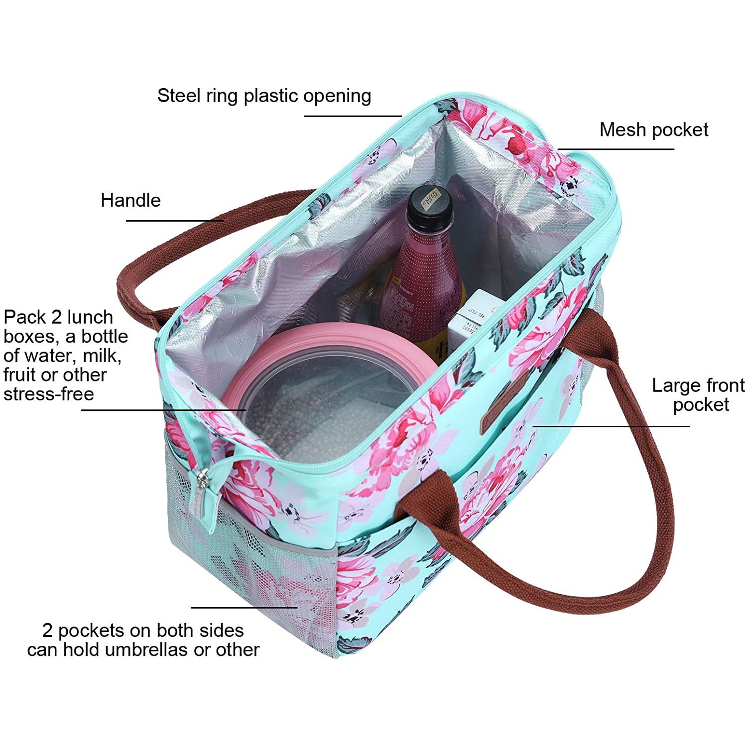 Amersun Yalıtımlı Öğle Yemeği Çantası - Çiçek öğle yemeği çantası örneği Hafif ve Taşınabilir, atıştırmalık yiyeceklerinizi ve öğle yemeği kaplarınızı paketlemek için mükemmeldir ve öğle yemeği çantanız, soğutucu çanta piknik çantanız, çeşitli çantalarınız veya alışveriş çantanız olarak kullanılmaya uygundur. Çiçek öğle yemeği çantası bayan bayanlar için çok uygundur. - Geniş Açılış Tasarımı: Öğle Yemeği Çantaları Boyut: 11.8x9.56.5 inç (U*G*Y); Ağırlık: 0,84 pound, bu akıllı işlev, öğle yemeği kutusunu hızlı bir şekilde koymak ve çıkarmak için tasarlanmıştır, öğle yemeği hazırlığınıza çok kolaylık getirir.