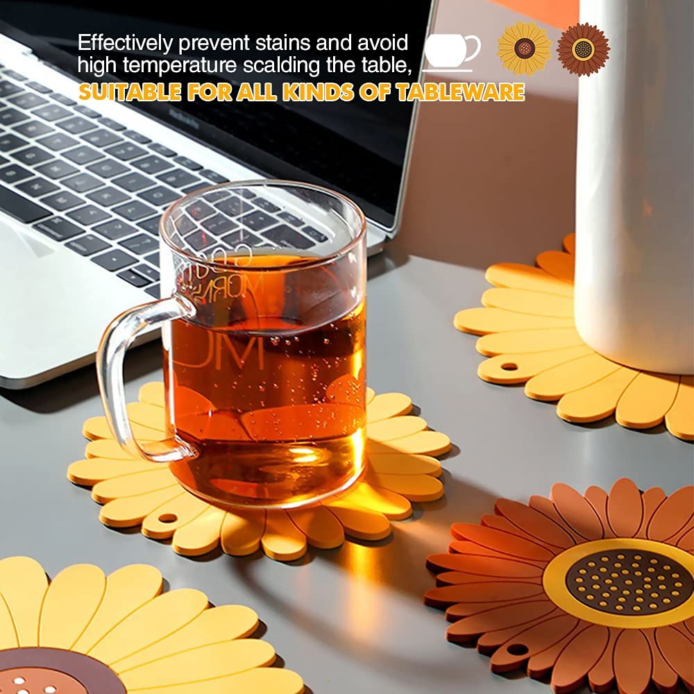 AYÇİÇEĞİ-SİLİKON ALTLIK SETİ 4 inç çapındaki silikon içecek altlıklarımız çoğu bardağa sığar. Masalarınızı, tezgahlarınızı ve tepsilerinizi temiz ve kuru tutmak için bu Cinamono altlıklarını kahve fincanı altlığı, şarap altlığı veya çay altlığı olarak kullanın. Silikon malzeme, ahşap masanın 80'e kadar haşlanmaya karşı dayanıklı olmasını etkili bir şekilde önleyebilir. - GÜZEL EV DEKORASYONU Bu güzel tasarlanmış çevre dostu su geçirmez bardak altlıkları ev dekorasyonunuz için harika! Yumuşak, kalın, yüksek kaliteli silikon malzemedir.