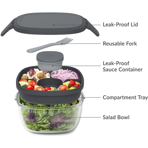 BÜYÜK SIZDIRMAZ SALATA KASESİ: Salata malzemelerinizi karıştırmak için bu geniş 7,6 fincan cam kase ile yiyecekleri daha uzun süre taze tutun. Kapağın etrafındaki benzersiz silikon conta ve kilitleme klipsleri, tepsiyle ve tepsi olmadan sızıntıyı önler. - MALZEMELERİ AYRI OLARAK SAKLAYIN: 4 bölmeli tepsi, seçtiğiniz malzemeler için 1 büyük 10 oz'luk bölme ve 2 küçük 5 oz'luk bölme ve ayrıca salata sosu için mükemmel olan sızdırmaz 3 oz'luk bir kap içerir - SOĞUK VEYA SICAK YEMEKLERİN KEYFİNİ ÇIKARIN : Bentgo Glass j'den fazlası içindir.
