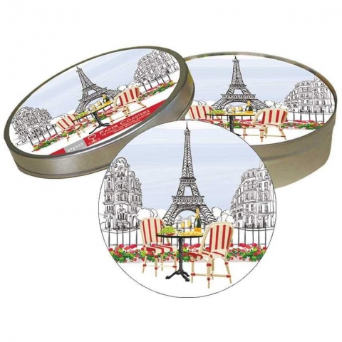 12'li set, Paris Temalı bardak altlıkları - Eyfel Kulesi Tasarımı - Cömert boyut - 4" çapında, hamur tahtası - Her iki tarafta renkli tasarım - Tasarım Martha Collins'in eseridir - Yuvarlak teneke kutuda paketlenmiştir.