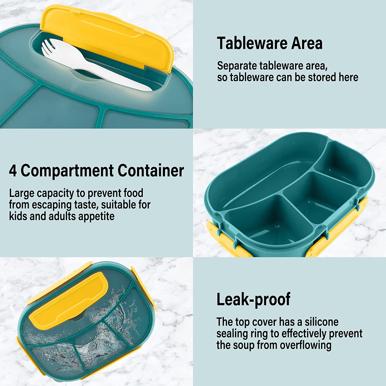Gıda Güvenliği - Bu çevre dostu öğle yemeği kutusu ile gününüzü güçlendirin, gıda sınıfı PP malzemeden, BPA içermeyen ve toksik olmayan, güvenli ve sağlıklı, dayanıklı ve tekrar kullanılabilir, size kaliteli ürünler sunmak için buradayız, güzel Öğle Yemeği Kutuları yaşam tarzınıza uyacak, hayatınızı kolaylaştıracak, harika yemeklerin tadını çıkaracak ve sorunsuz olacak şekilde tasarlanmıştır. - İdeal Porsiyon - 1800ml çocuk beslenme çantası 4 bölmeye sahiptir, 4 porsiyonun her biri çocuğun iştahına göre mükemmel şekilde dağıtılır. yapabilirsin.